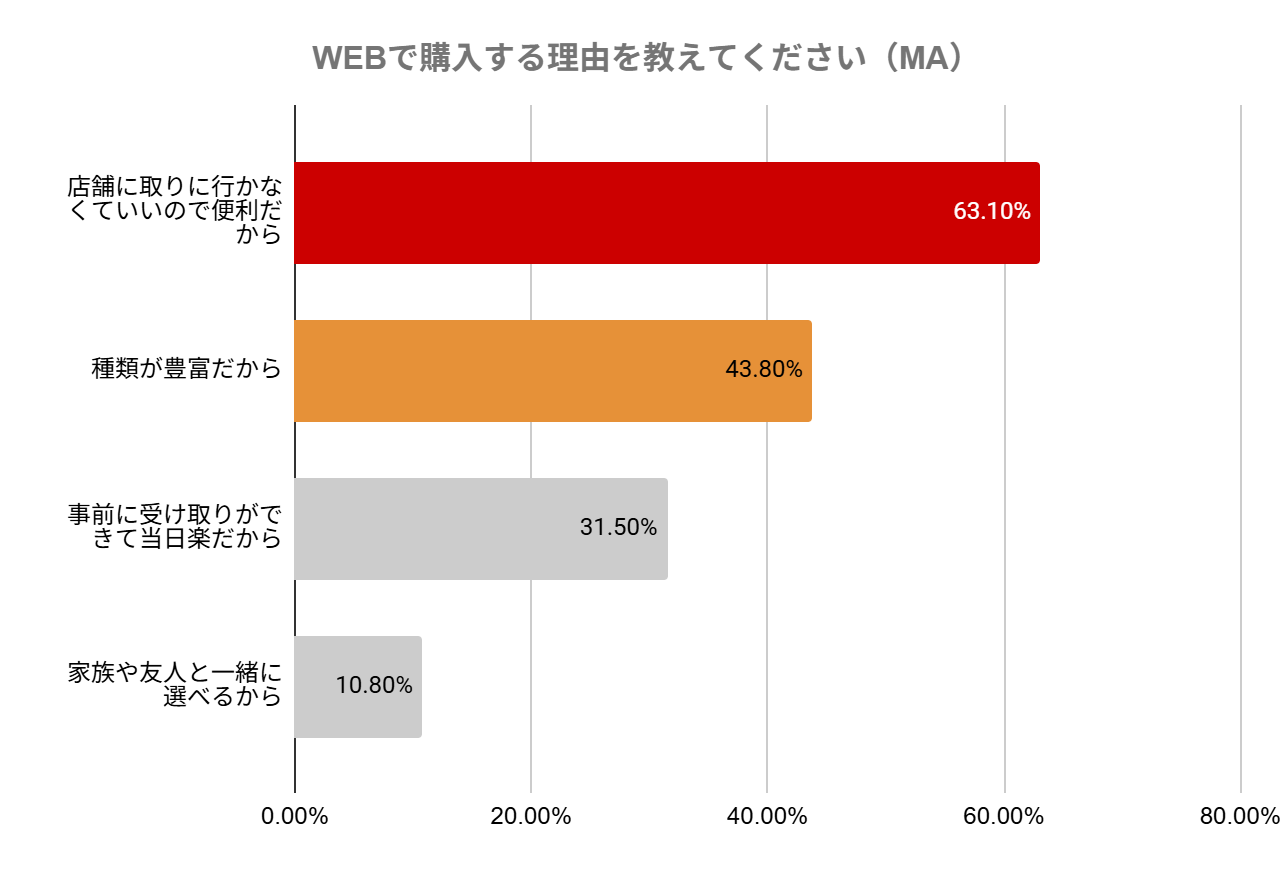 通販で購入する方が4割以上!通販を選ぶ理由は「店舗に取りにいかなくていいので便利だから」が約63%と1位。次いで「種類の豊富さ」が魅力と答えた人が約43%という結果に。