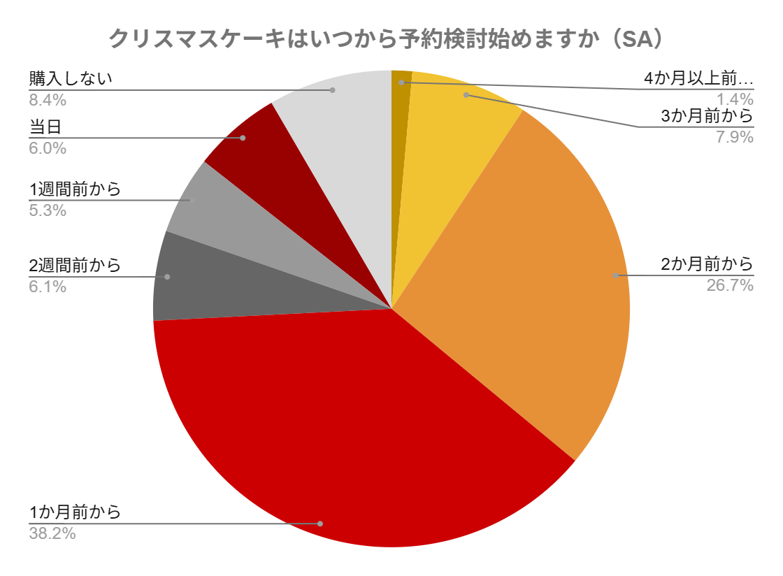 クリスマスケーキ購入検討は「1ヶ月前から」が約38%とスタンダードに。「2か月前から」検討する人も約26%と多く、「当日」は約6%とごく少数。
