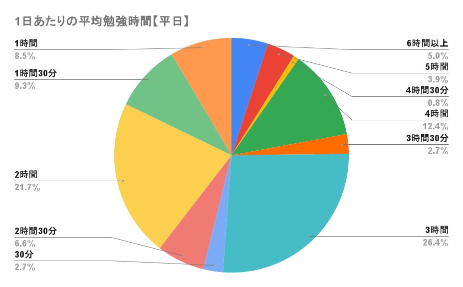 勉強時間で最も多かった回答は、平日が3時間の26.4%、休日は6時間以上の32.2%でした。