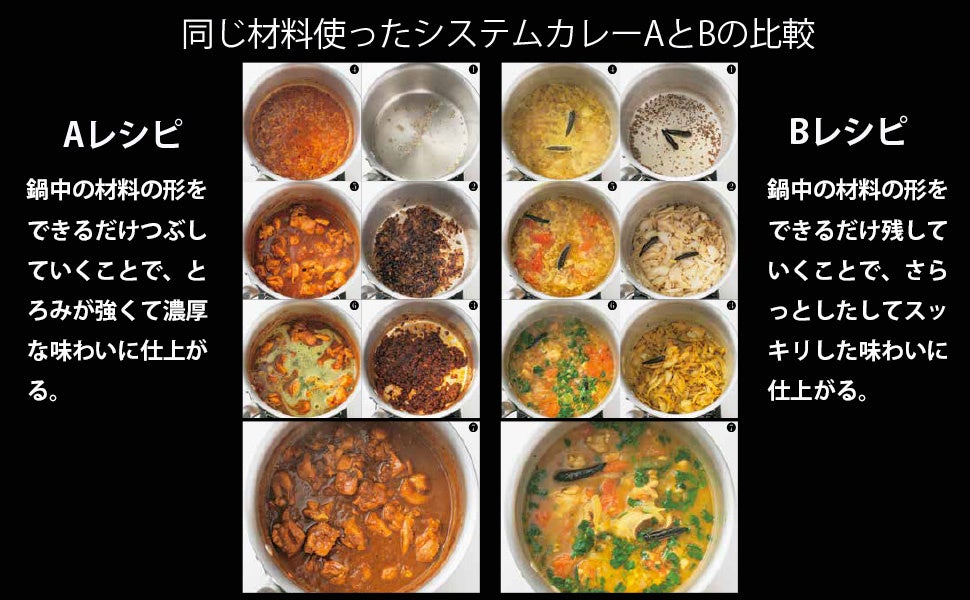 このゴールデンルールに基づきながら、食材の「形」や加熱の際の「火加減」、「加熱時間」などに変化を与え、カレーの「とろみ(粘度)」や「色」「味」を調整することでイメージ通りのカレーをシステマティックに作り出せるようになる、ということが本書では詳しく解説されています。