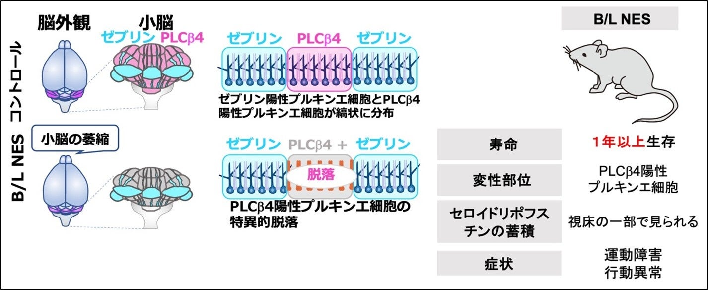 神経組織特異的カテプシンB・L二重ノックアウトマウス(B/L NES)では、運動障害や行動異常が認められた。このマウスの脳組織を解析すると、小脳の萎縮が見られ、小脳皮質に縞状に分布するPLCβ4陽性プルキンエ細胞が脱落していた。