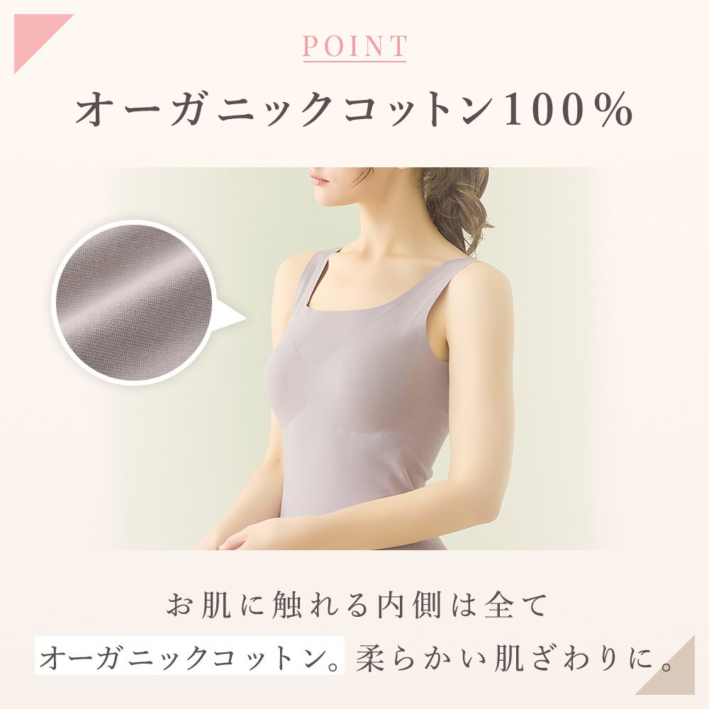 今年デビュー15周年を迎える「KIREILABO(キレイラボ)」は、長年肌への優しさを研究し、新たな製法で肌にあたる部分がオーガニックコットン100%で、外側には伸縮性のある素材を使用した生地を開発。通常の綿100%インナーにはないストレッチ性を確保しました。さらに、縫い目による刺激に対しても、縫い糸を一切使わない接着技術を活用した「完全無縫製®」で、肌への優しさを組み合わせた商品となっております。