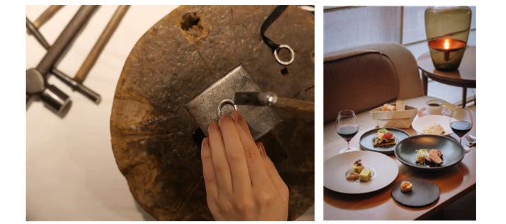 実用的且つ美術的な要素を兼ね備えた「用の美」を追求する工房ならではのものづくり体験の他、さらに銀器そのものの素晴らしさもご体感いただきたいという想いから、銀食器を使用した食体験も併せた贅沢な企画です。