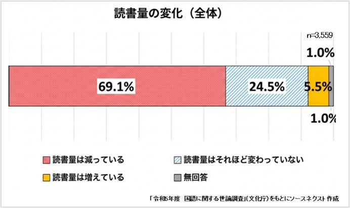 また、「読書量は以前に比べて減っている」と回答した人の割合が69.1%という結果が出ました。