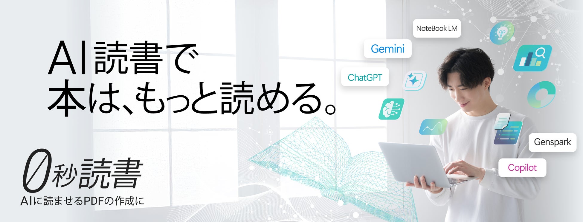 「0秒読書」は、手持ちの電子書籍や資料を、AIで“使える知識”として活用するためのツールです。Gemini、NotebookLM、ChatGPT、Copilot、GensparkをはじめとするAIサービスを通じて、本をすべて読まなくても、要点を把握し、必要なところから使えます。