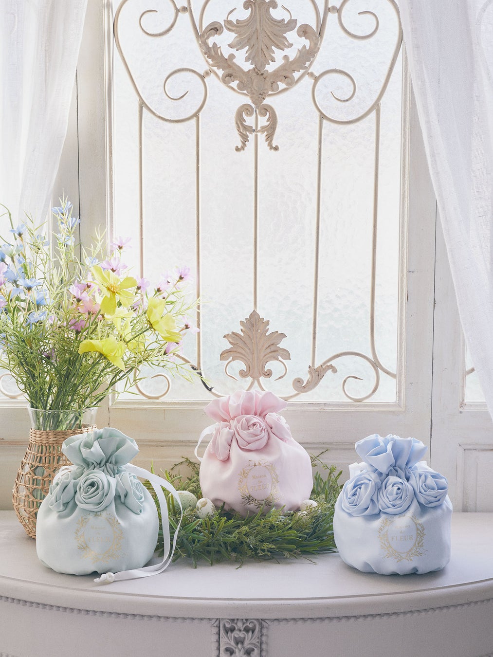 そのほか、立体的なローズを組み合わせたパステルカラーの巾着をラインアップしております。
