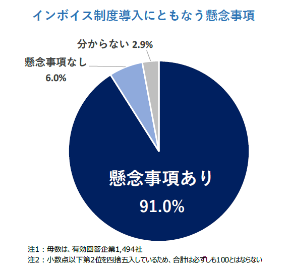インボイス制度の導入による懸念事項(現在/今後)について尋ねたところ、「懸念事項あり」の企業は91.0%と9割にのぼった。「懸念事項なし」は6.0%、「分からない」は2.9%だった。
