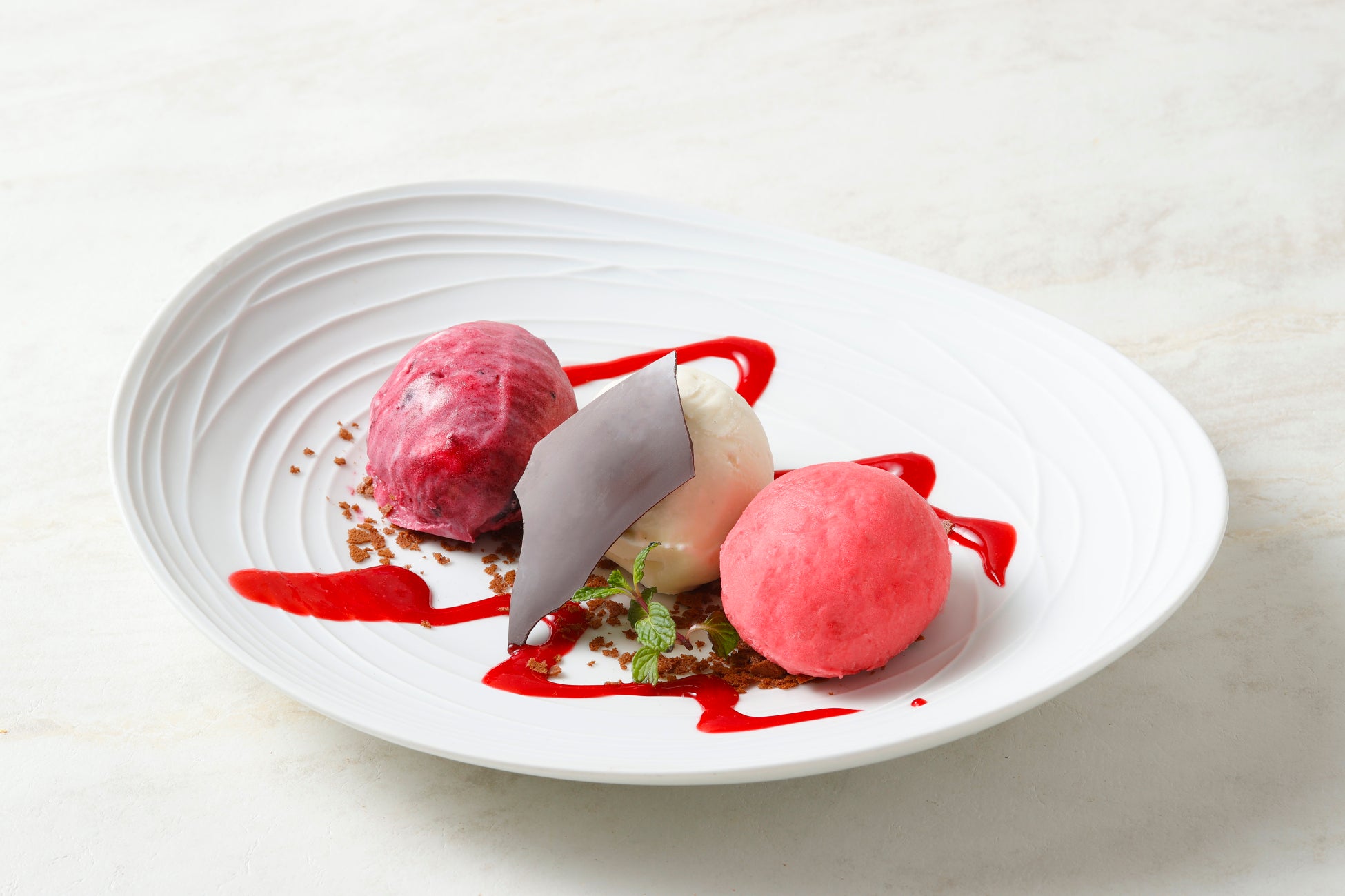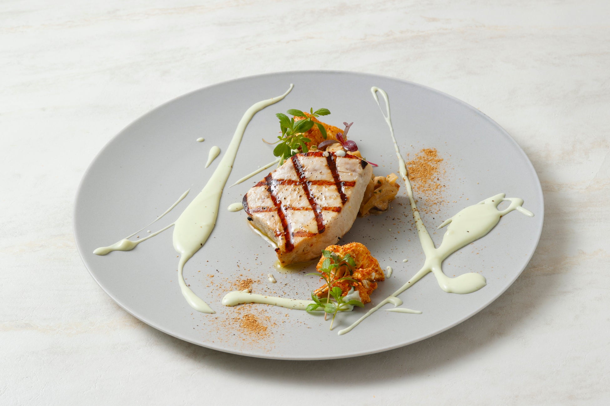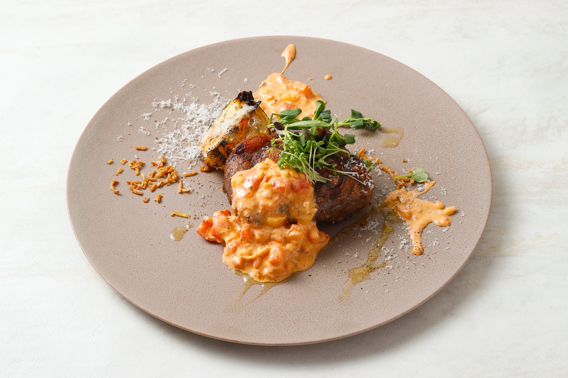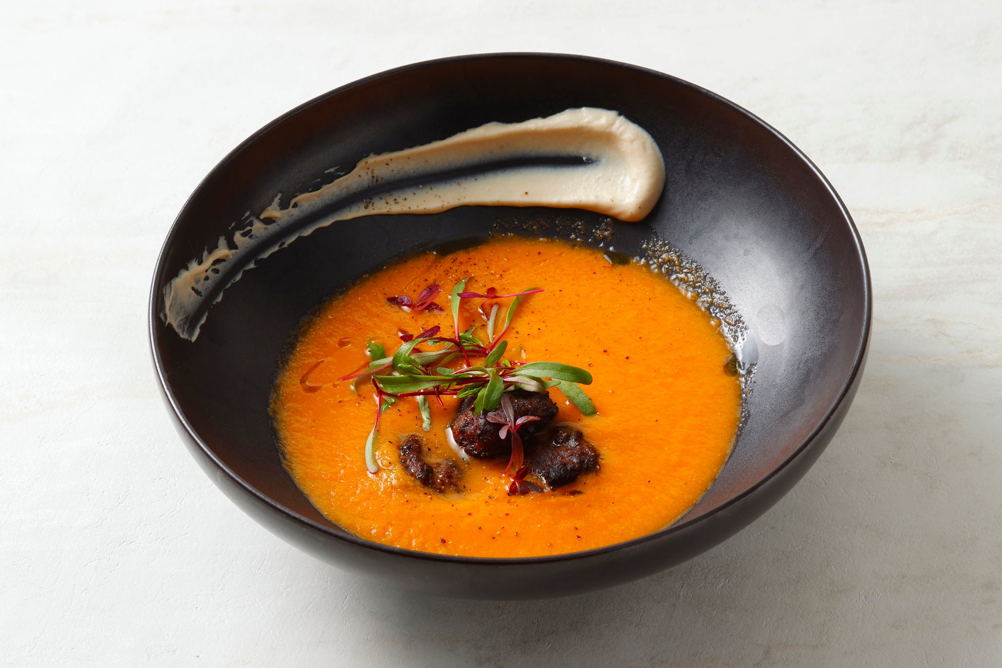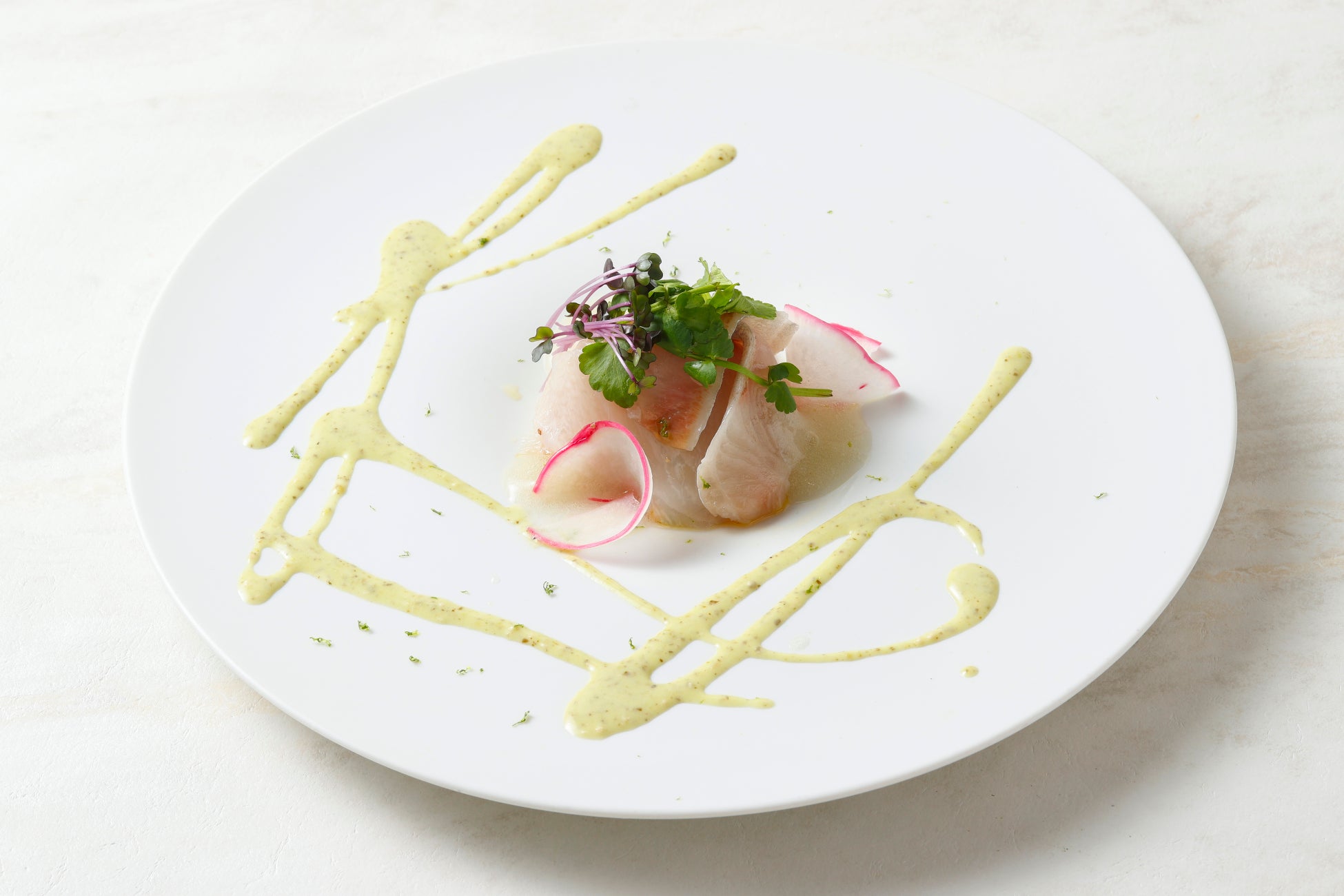 スターターには、食欲を引き立てるバジルクリームと、柚子胡椒がさっぱりとした『愛媛県産カンパチのマリネ』、トルコ料理の「キョフテ」をヨーグルトフムスと合わせアレンジした異国感漂うスープ、『ドマテスチョルバス』が登場。