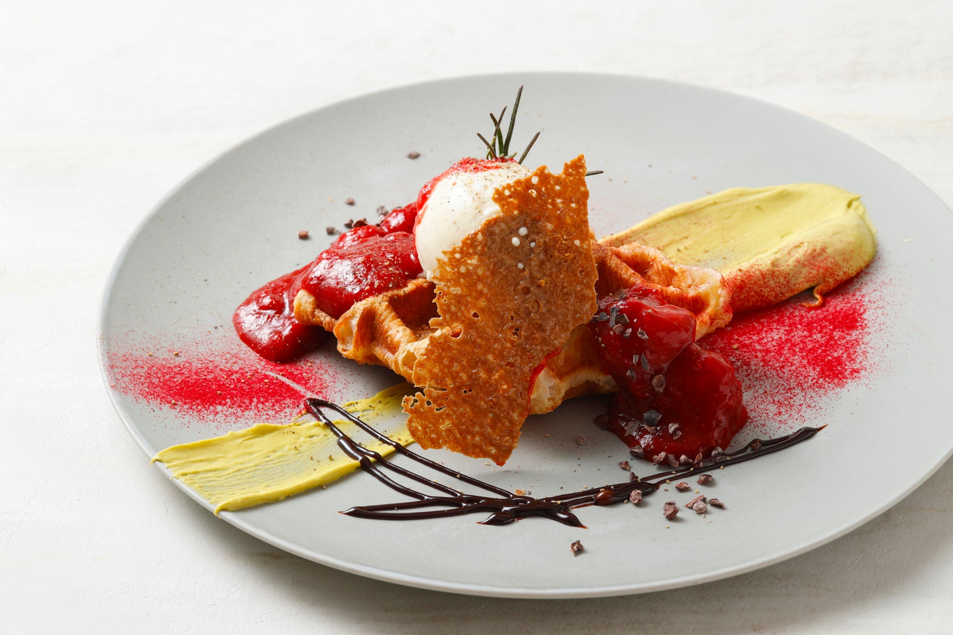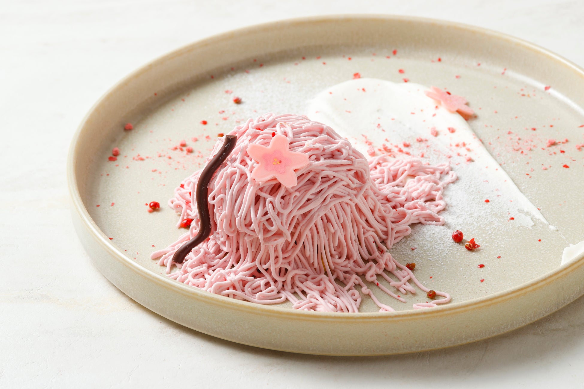 デザートは、季節を彩る薄ピンク色が美しい『桜モンブラン』や、いちごとピスタチオの相性抜群の味わいにサクッとした食感も楽しめる『クロッフル』が登場します。