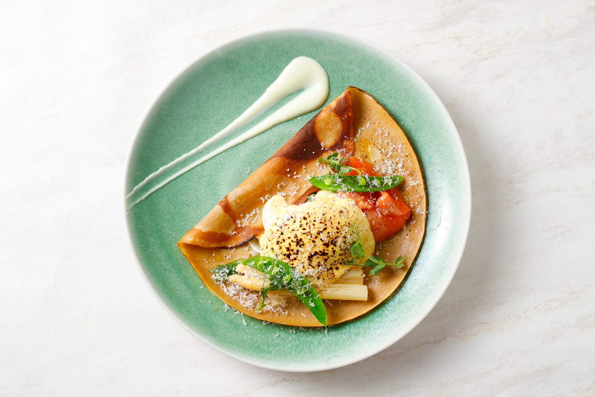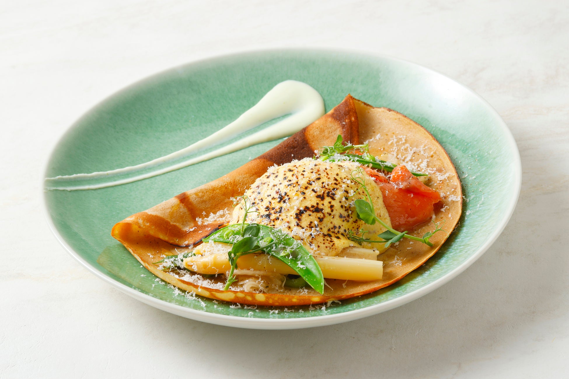 ヘルシーなそば粉のガレットに、ホワイトアスパラガスとスモークサーモン、菜の花のアップルビネガーマリネをのせ、ポーチドエッグにマスタードオランデーズソースをかけました。さらに仕上げにパルミジャーノチーズを振りかけた女性人気NO.1の一品です。
