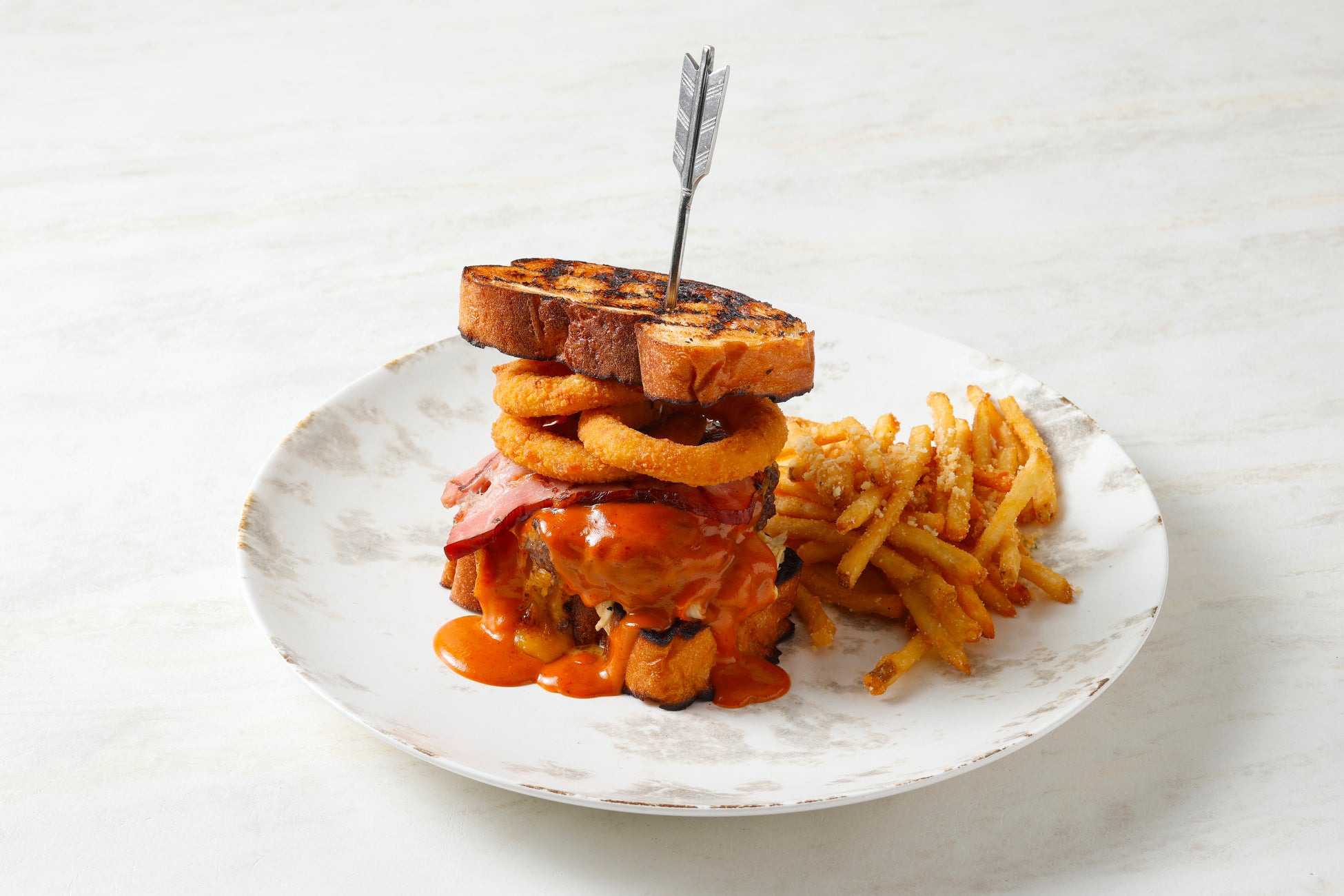 ビーフパテ150gにレッドチェダーチーズ、浅草ベーコン、オニオンリングを合わせ、石窯ブレッドでサンドした高さ20cmほどに及ぶ豪快なバーガー。コチュジャンマスタードBBQソースやシラチャーコールスローがピリッと辛く、サイドのチーズ&ハニークランチポテトが“甘塩っぱい”でクセになるシェフ一押しの一品です。