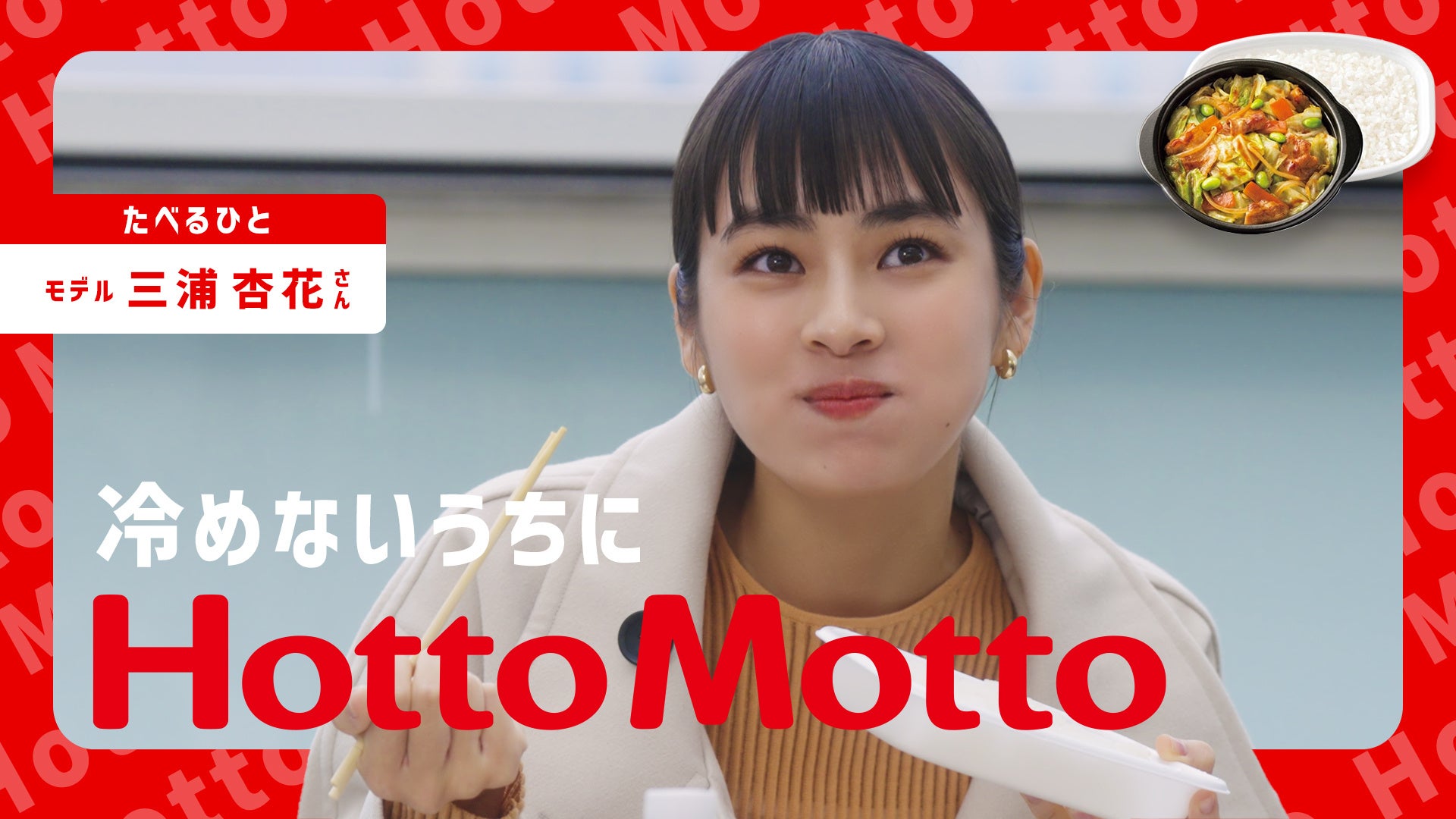 「ほっともっと」のお弁当を購入、食べるまでのワクワク感、夢中で食べて、食べ終わったあとの満足感をテンポよく、印象的に描きました。記念すべき第一弾には俳優の三浦杏花さんと宇佐卓真さんが登場。「ほっともっと」のお弁当を冷めないうちに食べる姿、夢中で食べる姿をぜひご覧ください。