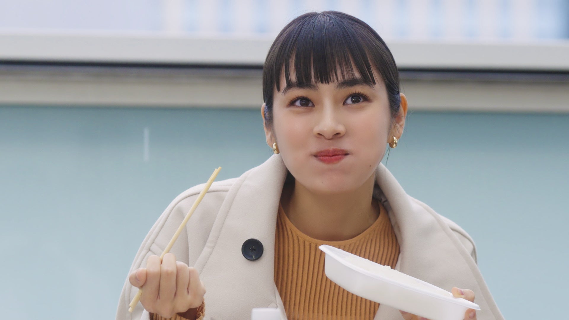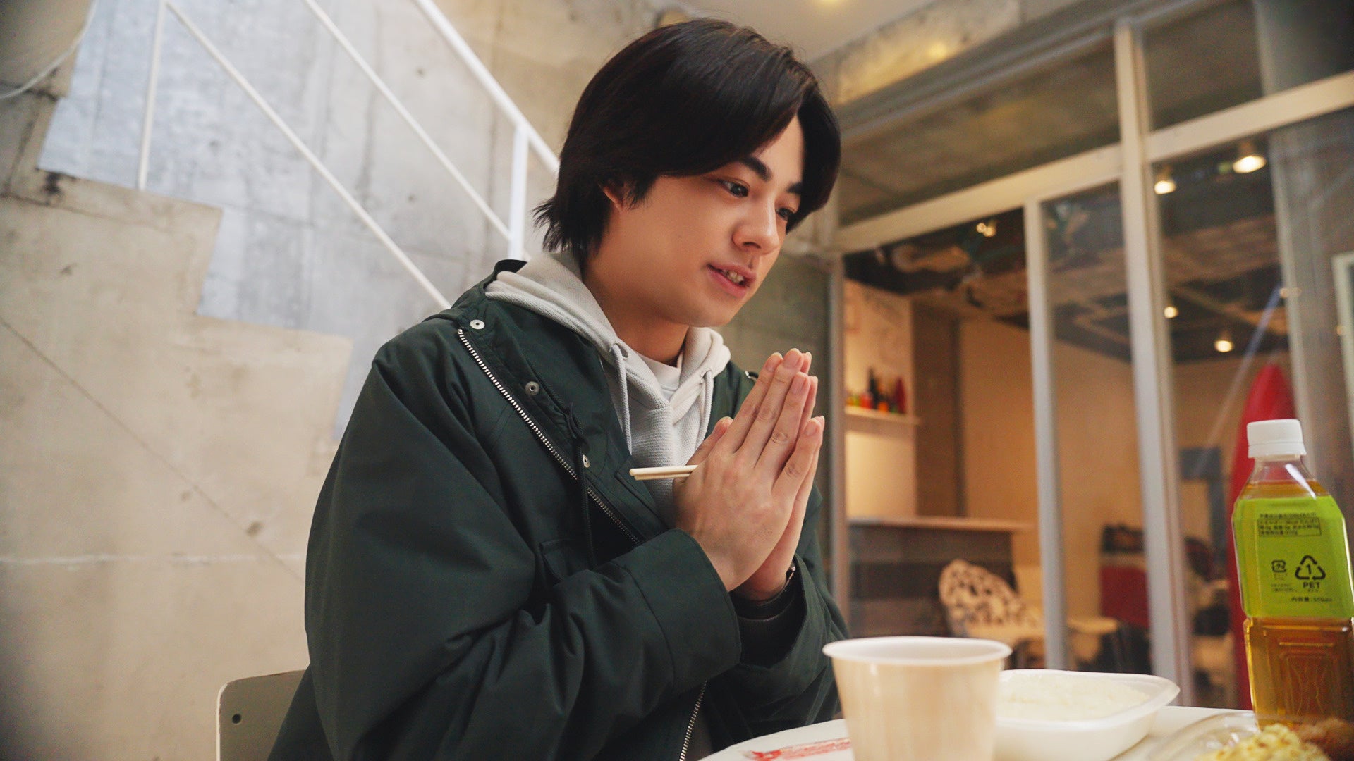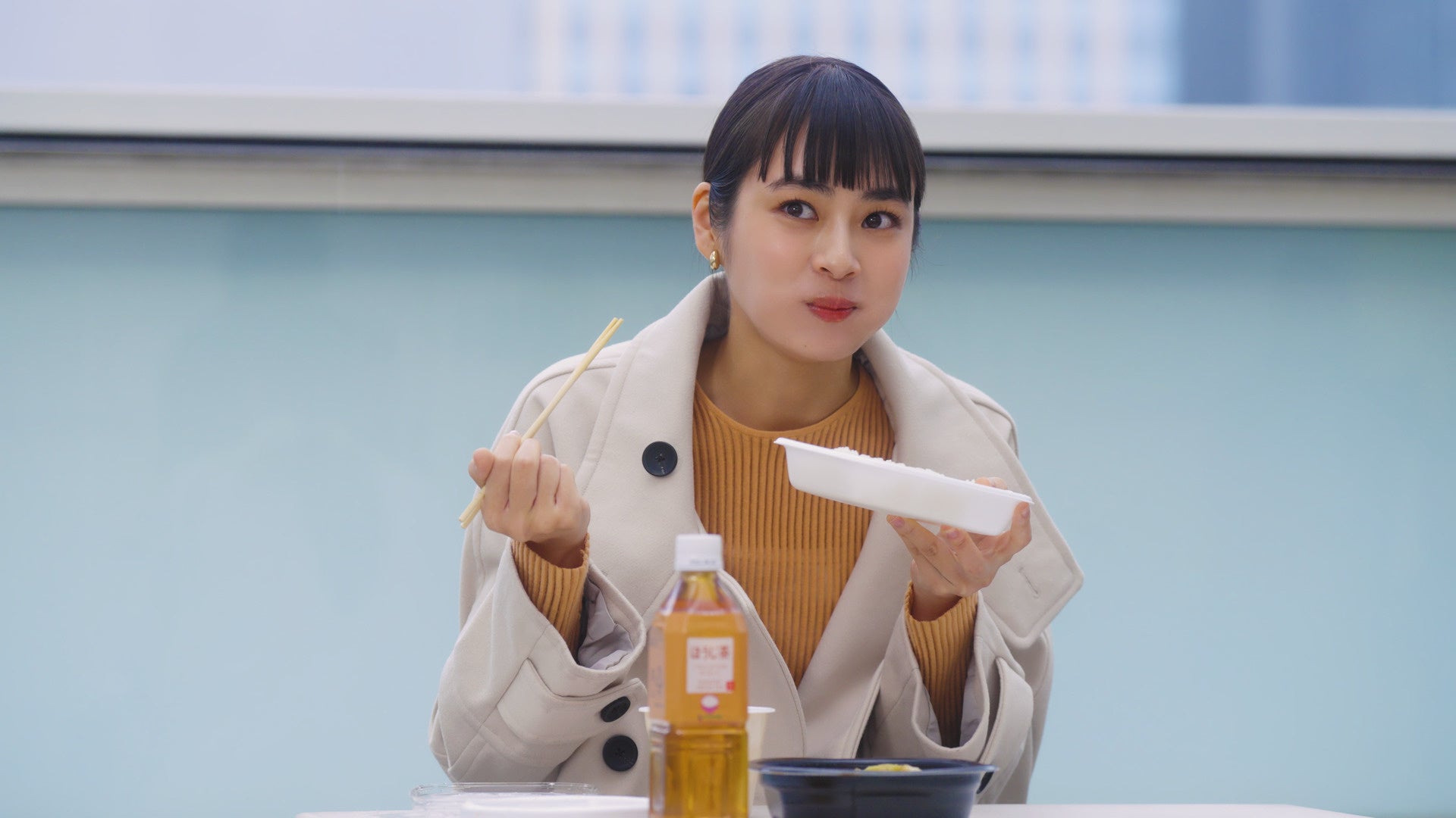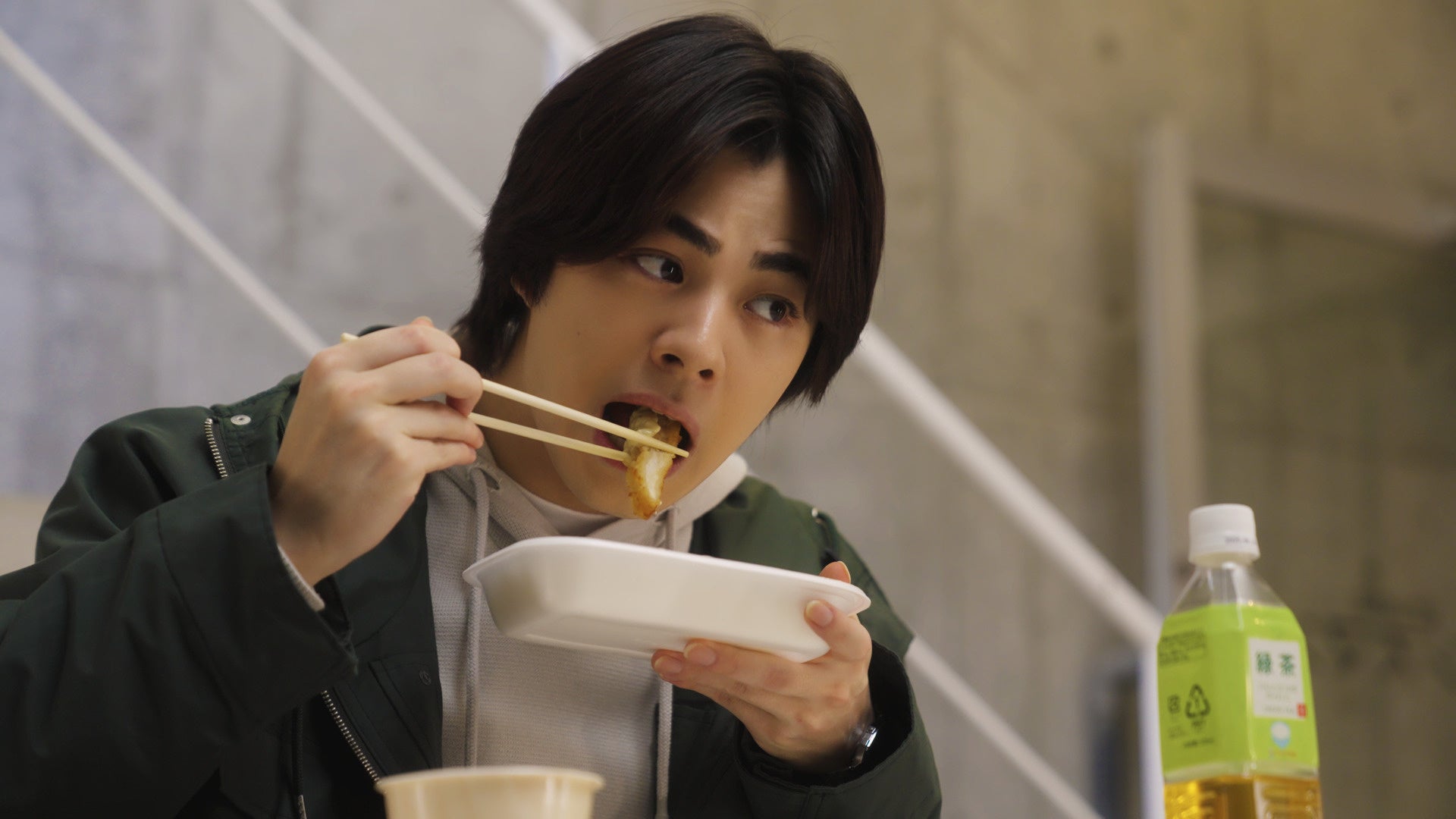 冷たい雨が降る中、撮影がスタート。ただ、そんな雨も全く気にならないほど、食事シーンでは「冷めないうちに」お弁当を夢中で食べる姿が印象的でした。