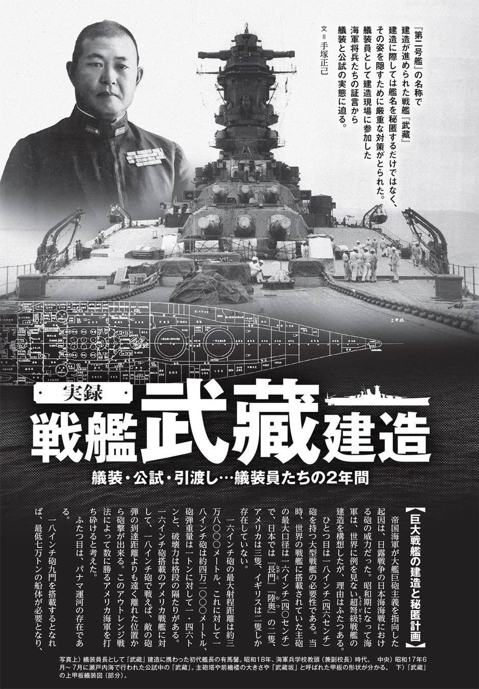 第一特集は、日本が誇った巨艦、大和型戦艦の二番艦『武藏』の建造に艤装員として携わった海軍軍人たちの証言から、その建造と各種試験の実態に迫る「実録・戦艦武藏建造~艤装・公試・引渡し…海軍艤装員たちの2年間」。艤装とは、出来あがった船体の内外に機関(エンジン)や砲など各種パーツを取り付けて艦として完成させるまでの工程のこと。海軍では、のちにその軍艦に乗り組むことになる軍人たちは艤装段階から「艤装員」として建造現場に配置され艤装に携わるとともに、完成後に行われる機関や主砲発射などの各種テスト(公試)に立ち会った。彼らの証言から、進水後の『武藏』ができるまでの2年間の現場の実態を浮き彫りにする。
