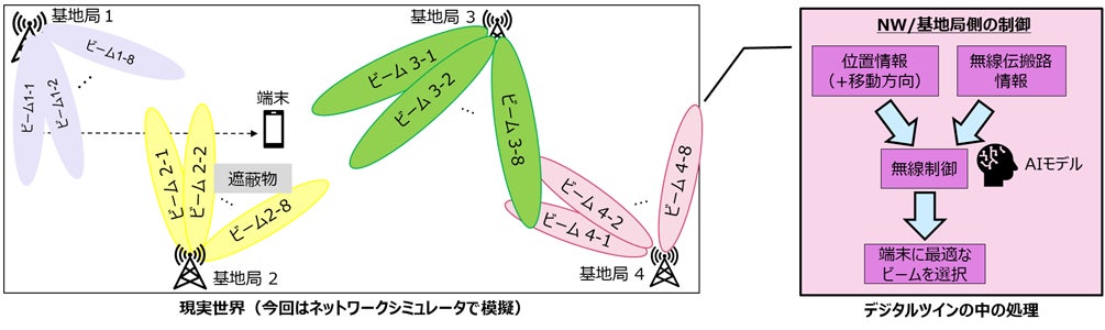 本実証は、東京駅周辺にある複数の基地局をデジタルツインで模擬したシミュレーション環境で行い