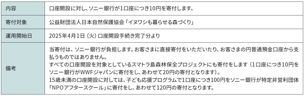 ソニー銀行株式会社(代表取締役社長:南 啓二/本社:東京都千代田区/以下 ソニー銀行)は、2025年4月1日(火)より、ネイチャーポジティブの実現を目指し、国内の森林保全や生物多様性の保全と再生を目的とした「イヌワシも暮らせる森づくり」への支援として、新規口座開設1口座につき10円を公益財団法人日本自然保護協会(以下、NACS-J)へ寄付する取り組みを開始しますのでお知らせします。
