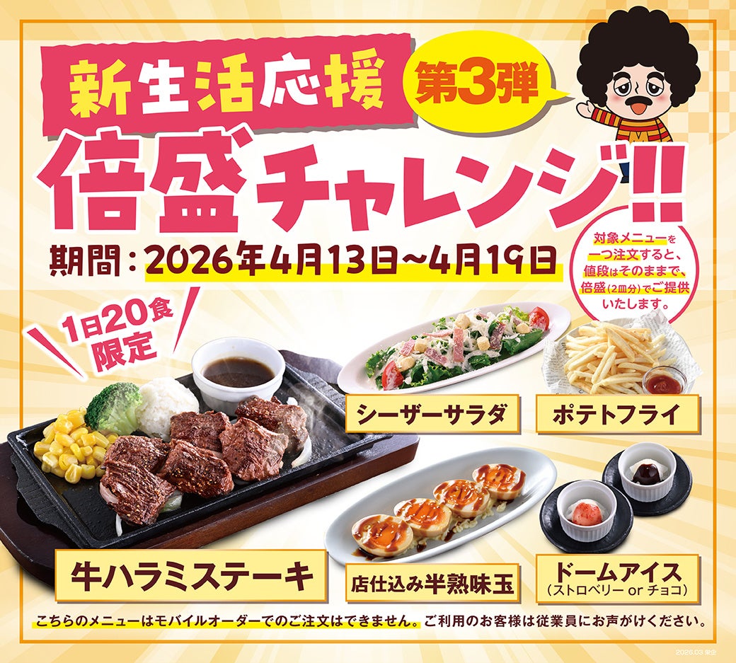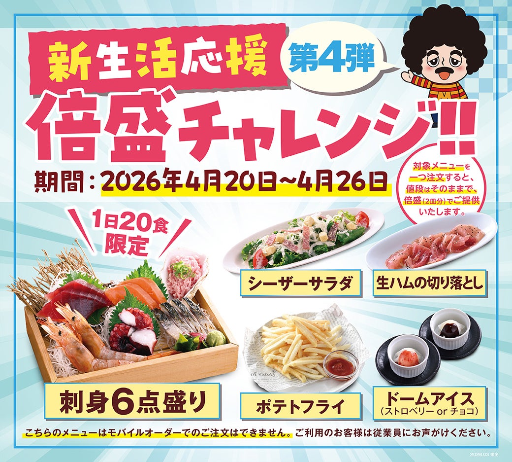 【新生活応援!】対象の7店舗限定で「倍盛チャレンジ!!」を実施いたします。対象の料理が週替わりでお値段そのまま倍盛になるほか、対象のドリンクを半額でご提供いたします!