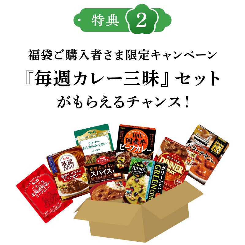 さらに、各福袋にはキャンペーンの応募用紙が同封されており、ご購入者さま限定で、レトルトカレー毎週1食分(計52食)が入った「毎週カレー三昧セット」が当たるキャンペーンにご応募いただけます。