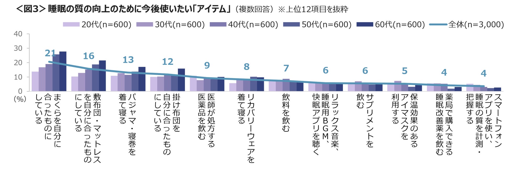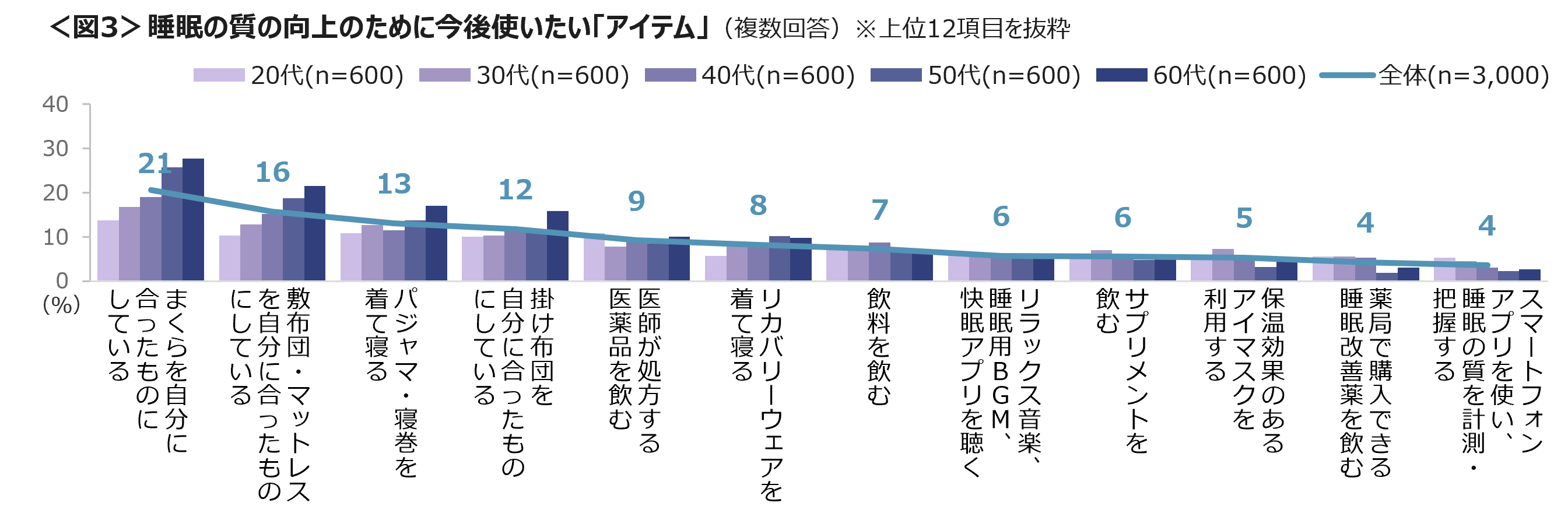 睡眠の質の向上のために「まくらを自分に合ったものにしている」「敷布団・マットレスを自分に合ったものにしている」「パジャマ・寝巻を着て寝る」「掛け布団を自分に合ったものにしている」が上位でいずれも寝装具に集中。<図3>