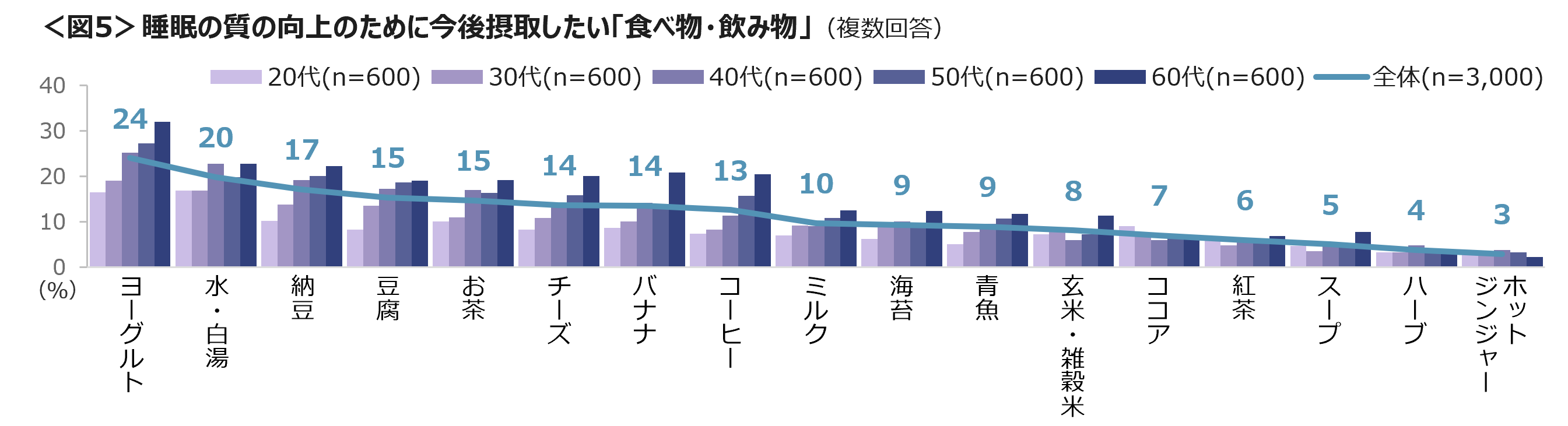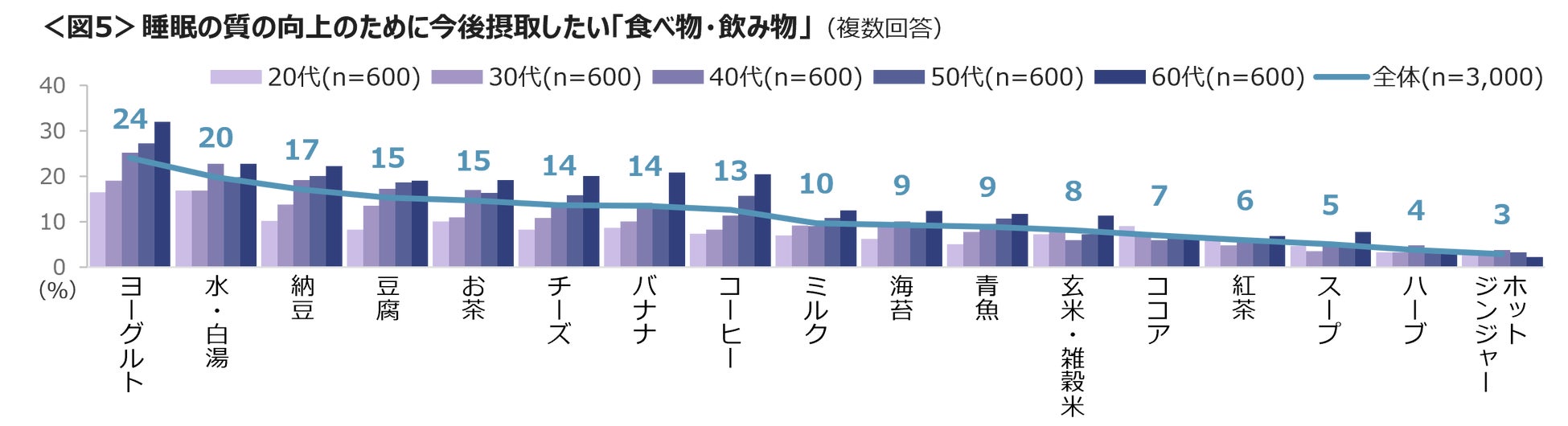 睡眠の質をよくするための喫食は「ヨーグルト」「水・白湯」が2割台。<図5>質のよい睡眠のために、実際に行動を起こしたいと思う人は全般的に年代が上がるほど高い。