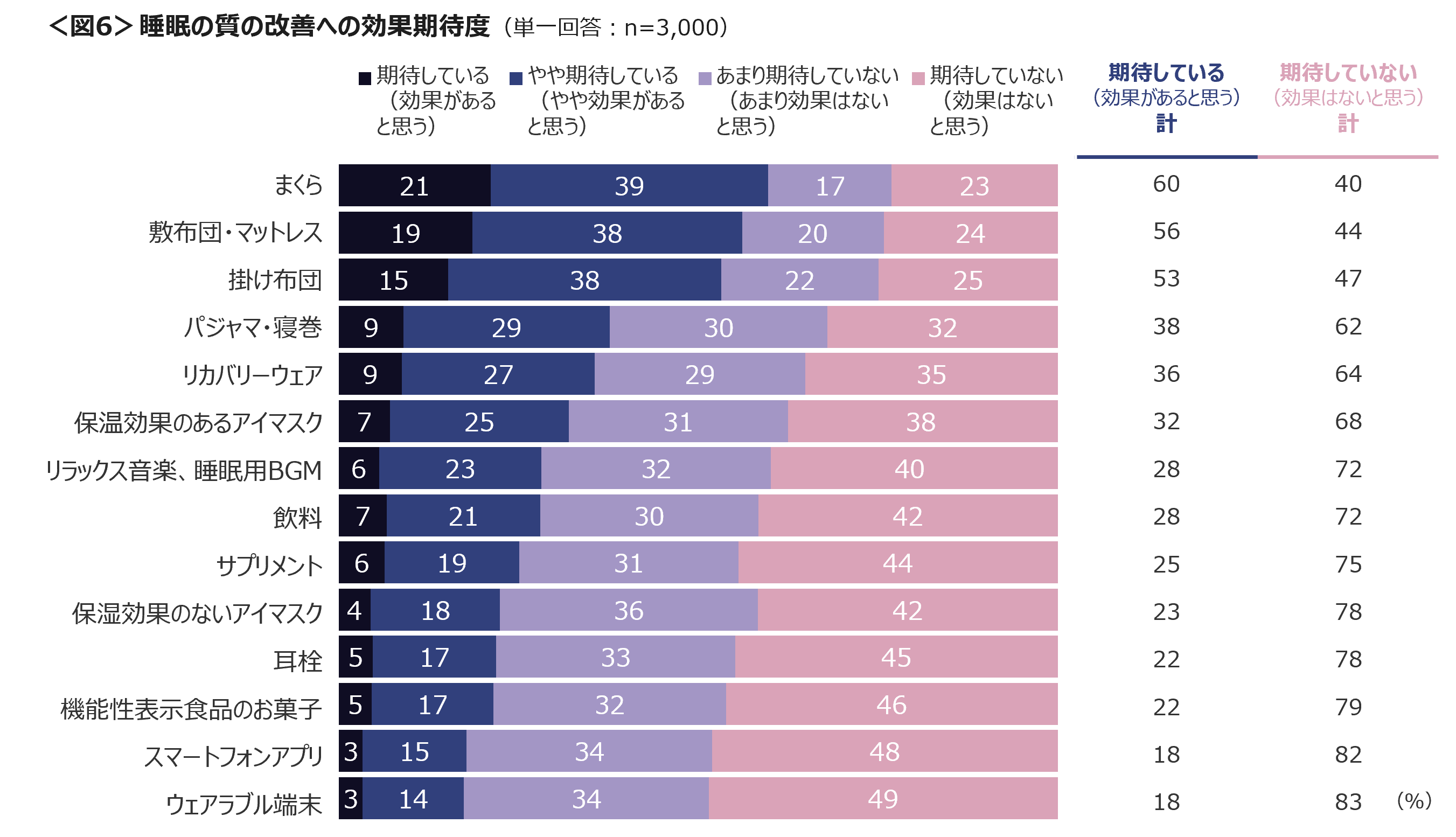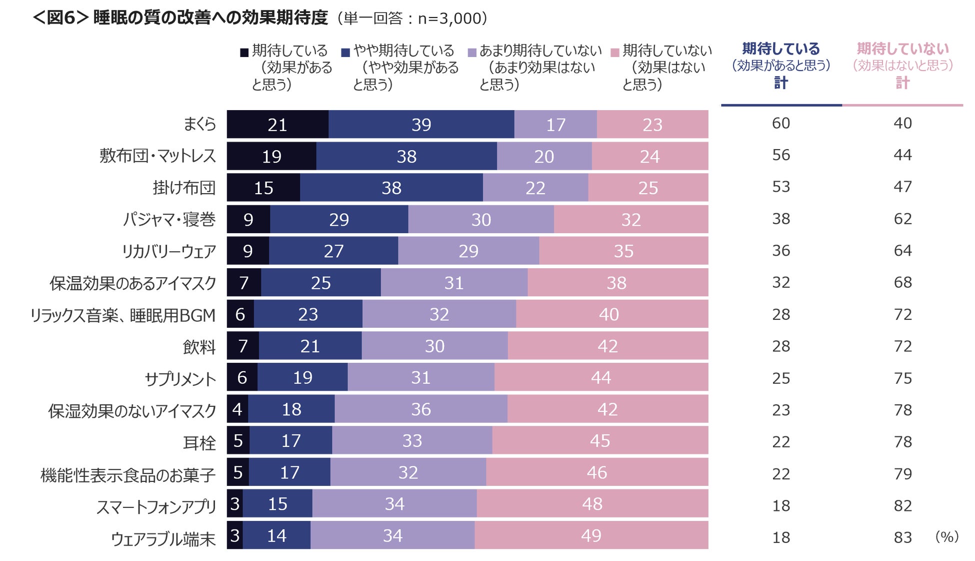 睡眠の質の改善にどの程度効果があると期待しているかを4段階で聴取した。期待している(効果があると思う)のは、「まくら」「敷布団・マットレス」「掛け布団」で半数超え、次いで「パジャマ・寝巻」「リカバリーウエア」といずれも寝装具に期待が寄せられた。<図6>