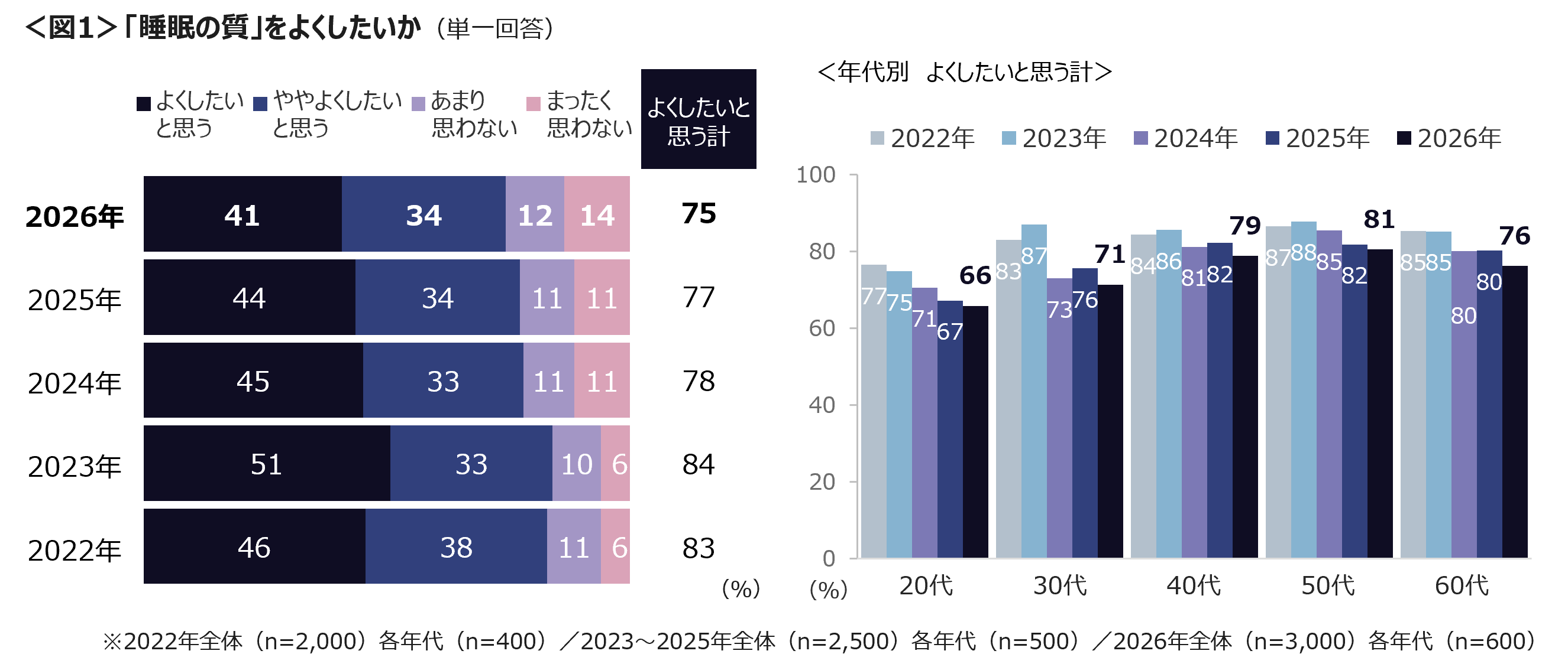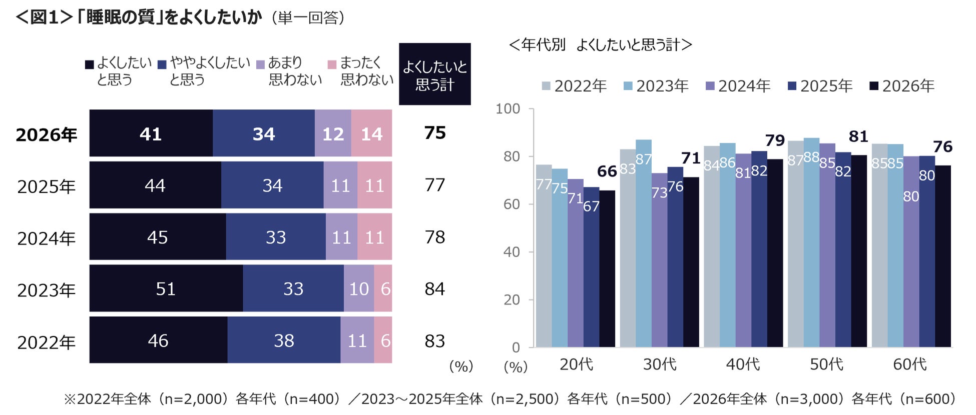 睡眠の質を「よくしたいと思う」は41%、「ややよくしたいと思う」は34%、合わせて75%は睡眠の質の改善を期待している。睡眠の質をよくしたい割合は、特に20代を中心にここ数年減少傾向にある。<図1>