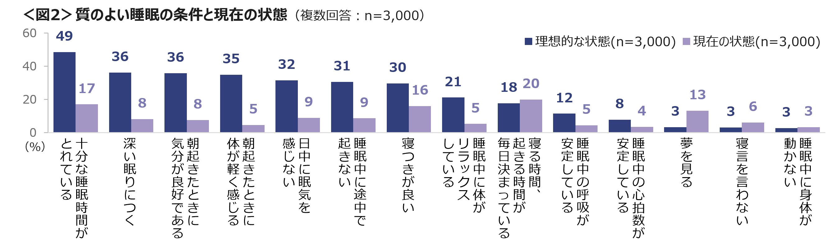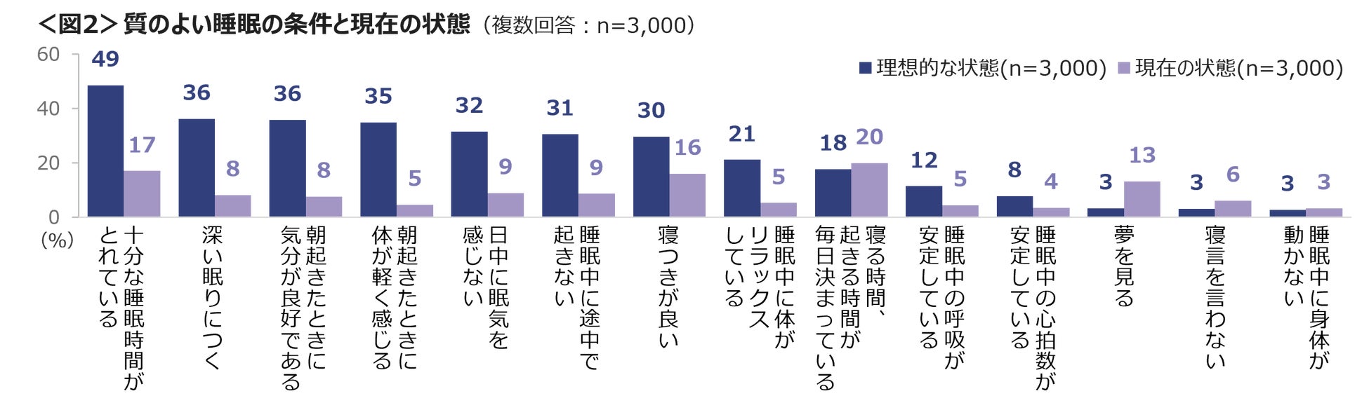 質のよい睡眠の条件は「十分な睡眠時間がとれている」が49%、「深い眠りにつく」「朝起きた時に気分が良好である」「朝起きた時に体が軽く感じる」が35~36%。理想としてTOP4までにあがる睡眠状態と自身の現状とのギャップは30pt前後と大きい。<図2>