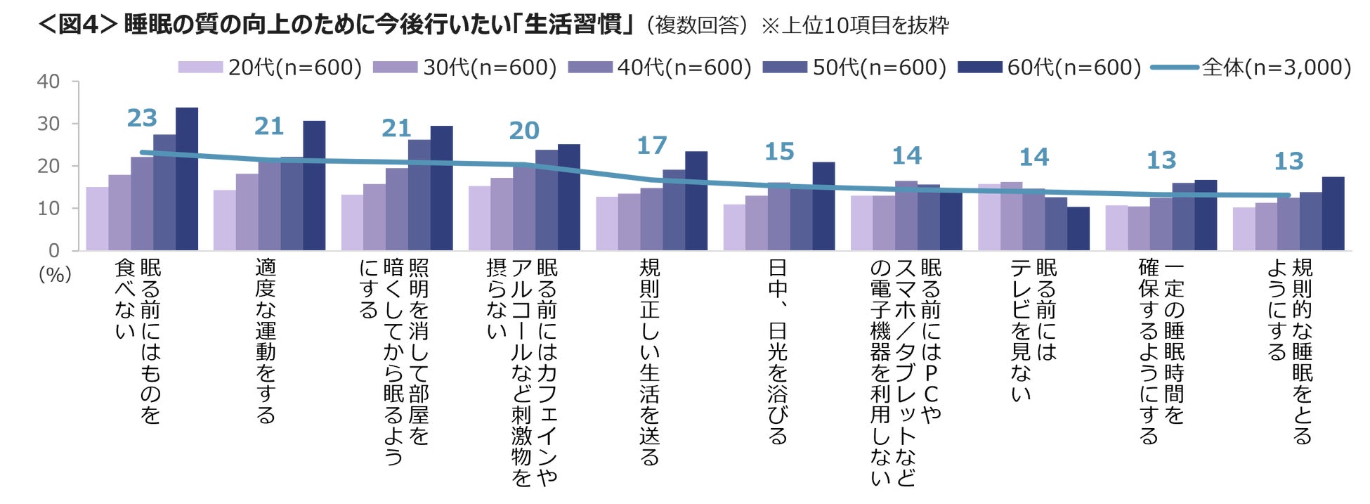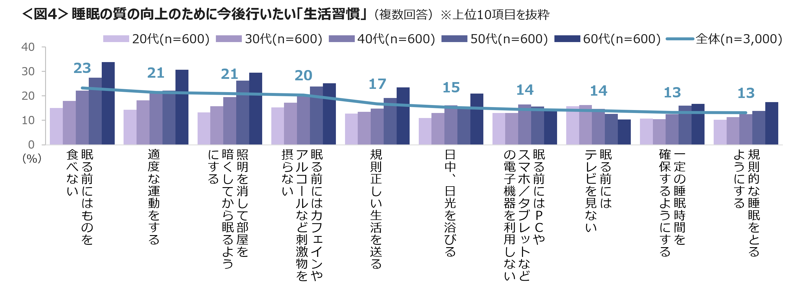 今後行いたい生活習慣は「眠る前にはものを食べない」「適度な運動をする」「照明を消して部屋を暗くしてから眠る」「眠る前にはカフェインやアルコールなど刺激物を摂らない」が2割台。<図4>