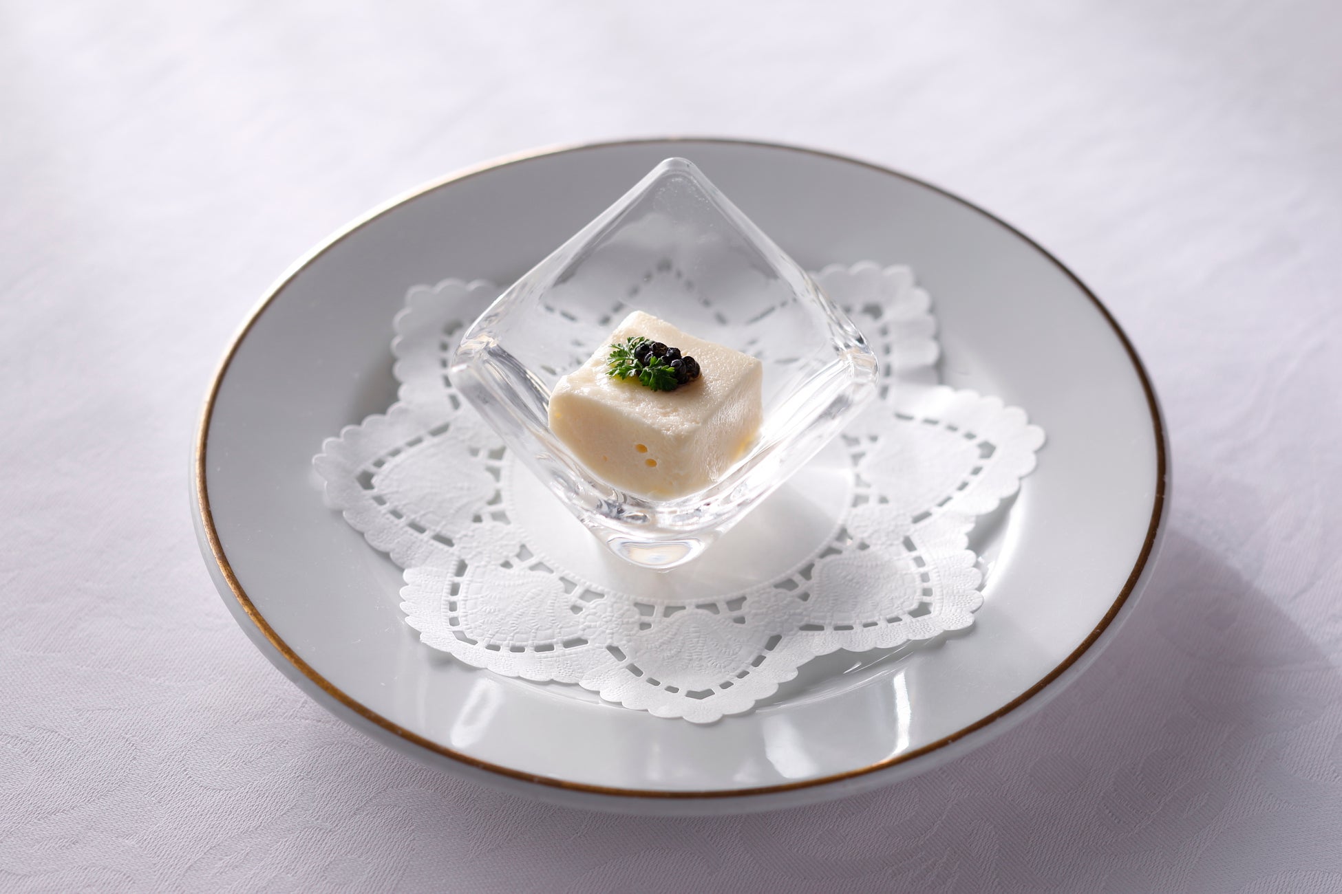 アミューズは旬のホワイトアスパラガスをババロアに仕立てました。前菜はラングスティーヌのカダイフ巻きに稚鮎のフリットや抹茶のブリオッシュを添えた一皿です。行者にんにくのソースでお召し上がりください。グリーンピースを使ったクリームスープは、心温まる味わいです。