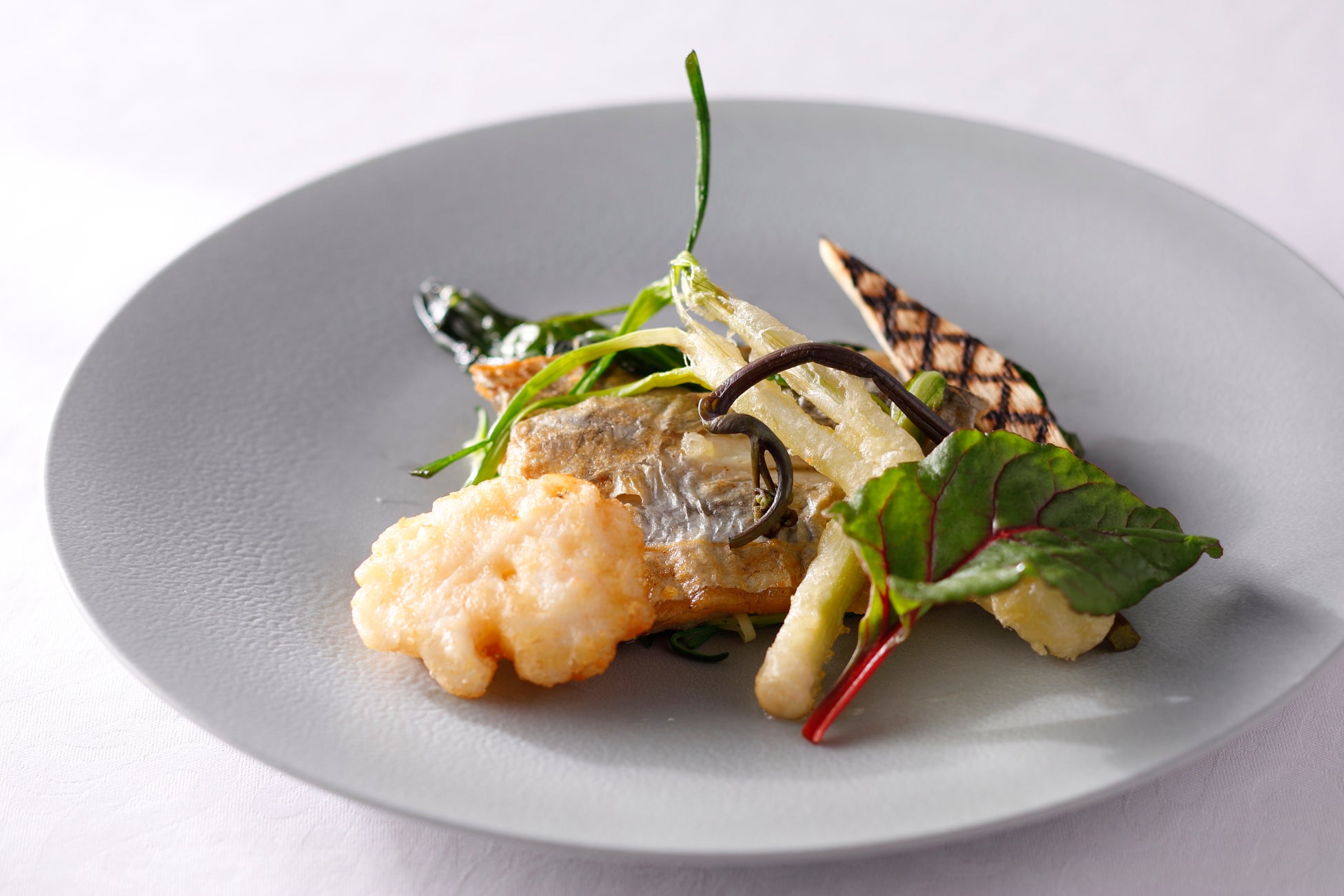 魚料理は、太刀魚のムニエルと白海老のフリットをご用意しました。旬の野菜のフリットやゼンマイ、ズッキーニと一緒にノワゼットソースでお楽しみください。肉料理では、茨城県産“常陸の輝き”豚ロースをソテーやシチューで贅沢にお召し上がりいただけます。デザートは、ルバーブと苺の味わいをフロマージュブランのムースと一緒にお楽しみください。