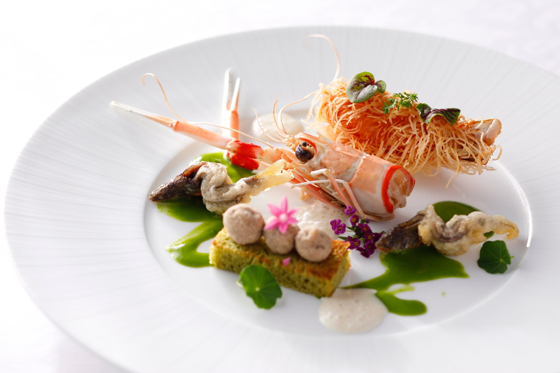ラングスティーヌのカダイフ巻きと稚鮎のフリット 行者にんにくのソース