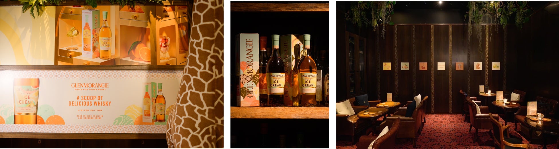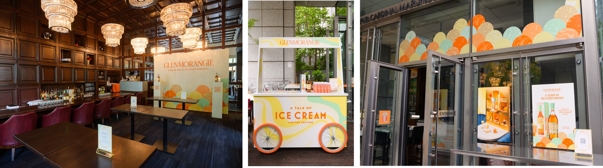 POP UP BARは、P.C.M パブ・カーディナル・マルノウチ(丸の内)の他、Bar LIBRE GINZA(銀座)、FIRE KING CAFÉ(代々木上原)の都内3店舗にて展開。アイスクリームのように甘く、クリーミーでバニラのような味わいの「グレンモーレンジィ アイスクリーム」を活かした、POP UP BAR限定の3種類のカクテルをお楽しみいただけます。また、各店舗ごとに「グレンモーレンジィ アイスクリーム」の異なる装飾が施されています。まるでアイスクリームパーラーのような、贅沢で洗練された空間で、オリジナルのドリンクと共に「グレンモーレンジィ アイスクリーム」の世界観を満喫いただけます。