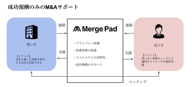 「MergePad」は、Web3に特化したM&Aプラットフォームです。新規にWeb3・ブロックチェーン技術を既存の事業に活用したい事業者と、優れた技術やプロジェクトを有する事業者が社会に与える影響を最大限引き出すことを目的としています。買収・売却を検討する事業者の匿名性に最大限配慮し、企業評価、候補企業の選出・選定、ご提案、交渉・成約まで幅広くサポート致します。今後、株式による買収・売却だけでなく、トークンに転換予定の社債等の譲渡や二次流通に関するサポートも提供する予定です。