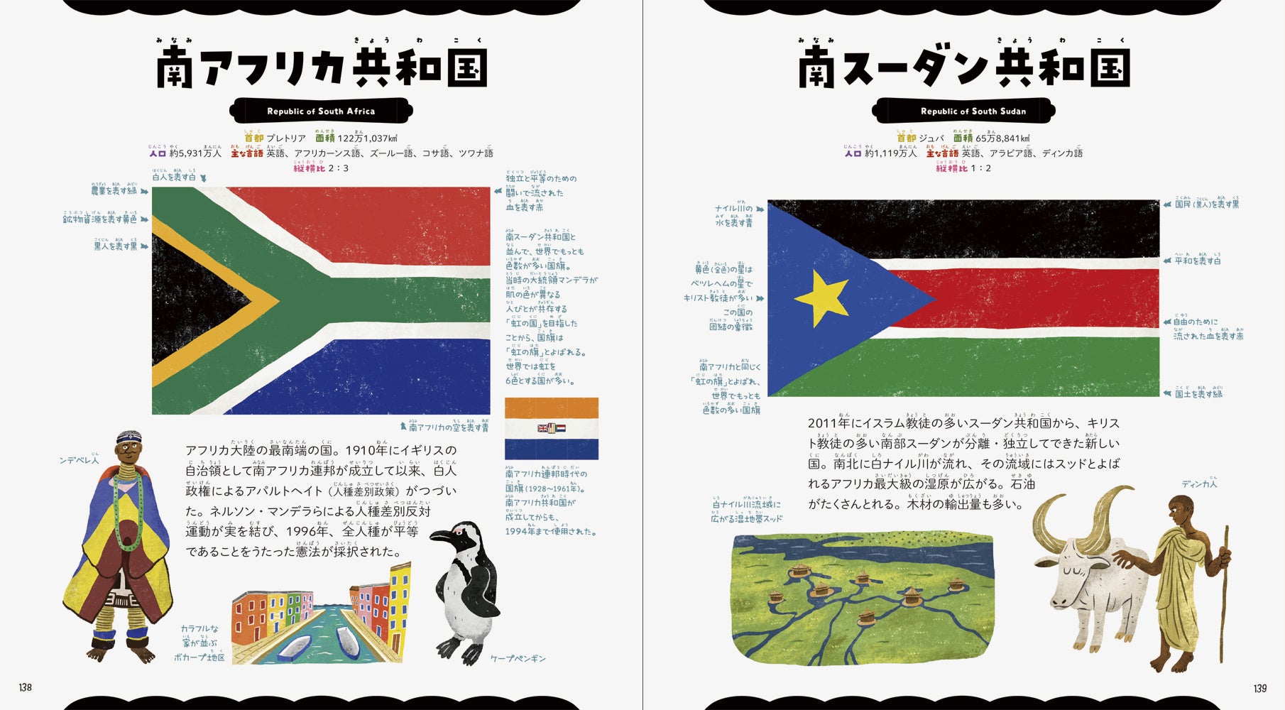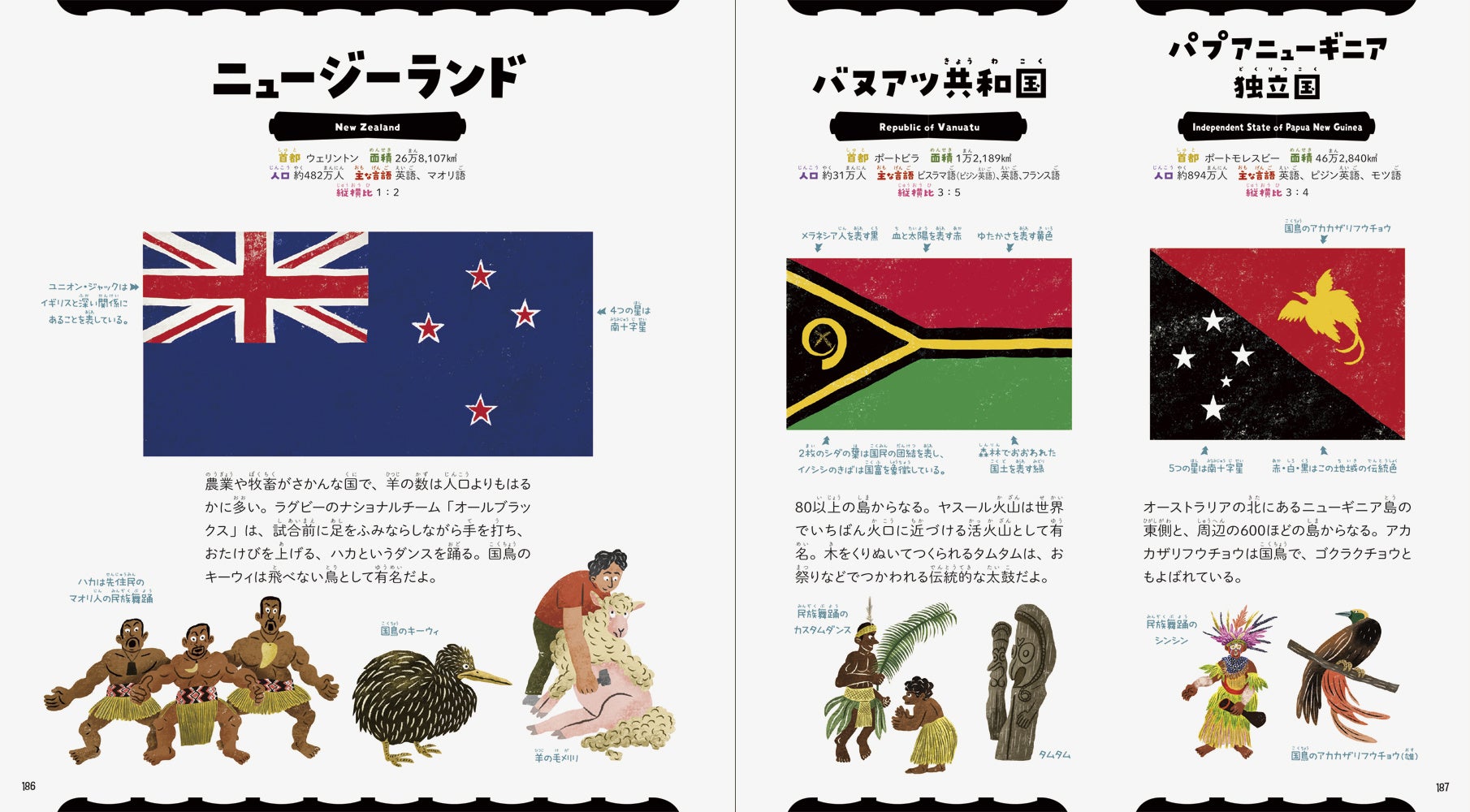 3. 世界遺産や観光地、民族衣装や民族楽器、お祭り、食べもの、特産品など、その国のあらゆることをイラストで紹介