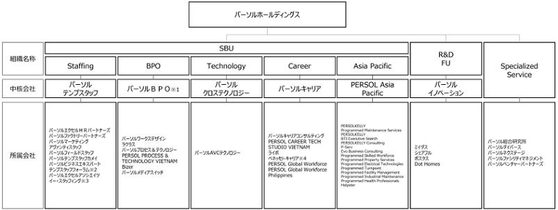 Staffing SBU, BPO SBU, Technology SBU,Career SBU, Asia Pacific SBUの5つの事業にて、企業価値のさらなる向上を目指します。