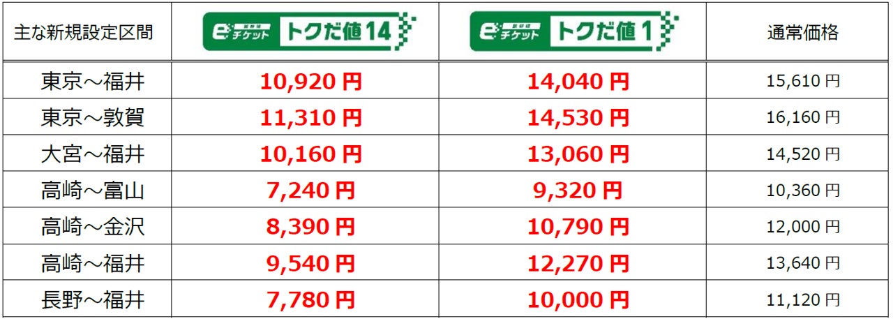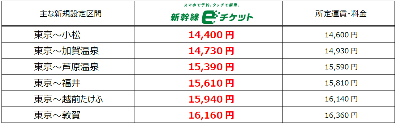 (2) 北陸新幹線金沢~敦賀間の開業に伴い、北陸新幹線の「新幹線eチケット」に設定区間を追加します。また、通常よりもおトクな割引商品「新幹線eチケット(トクだ値)」も設定します。