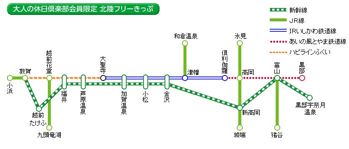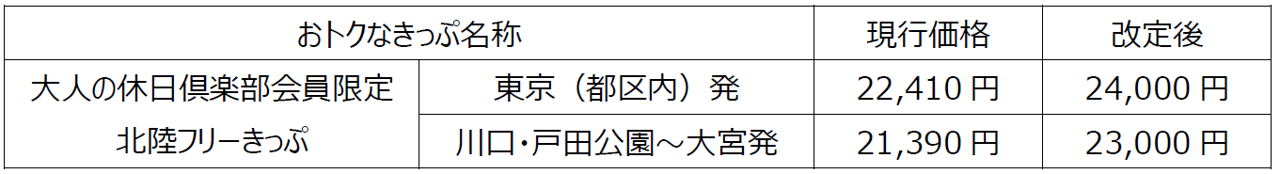※北陸新幹線金沢~敦賀開業前の「大人の休日倶楽部会員限定 北陸フリーきっぷ(都区内発22,410円、川口・戸田公園~大宮発21,390円)」は3月11日(3月12日利用開始分)が最終発売日となります。3月13日・14日・15日が利用開始日となるきっぷは発売いたしません。なお、3月12日利用開始分までの本商品はえきねっとでは購入できません。