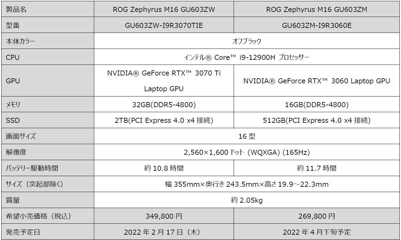 ROG Zephyrusシリーズでは、16型の大画面でゲームを大迫力で楽しめる「ROG Zephyrus M16 GU603ZW/GU603ZM」、15.6型の扱いやすいサイズのディスプレイを搭載した「ROG Zephyrus G15 (2022)」、1,449個のミニLEDで構成したAniMe Matrix™ディスプレイを天板に搭載する14型の「ROG Zephyrus G14 (2022)」と、より広い作業スペースの為の拡張ディスプレイとして使えるセカンドディスプレイをキーボード面に搭載した「ROG Zephyrus Duo 16 (2022)」の4製品を用意しています。また、ROG Zephyrus G14 (2022)に関しては、AniMe Matrix™ディスプレイを搭載しないモデルも用意しております。