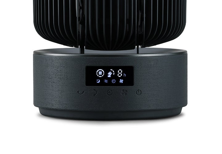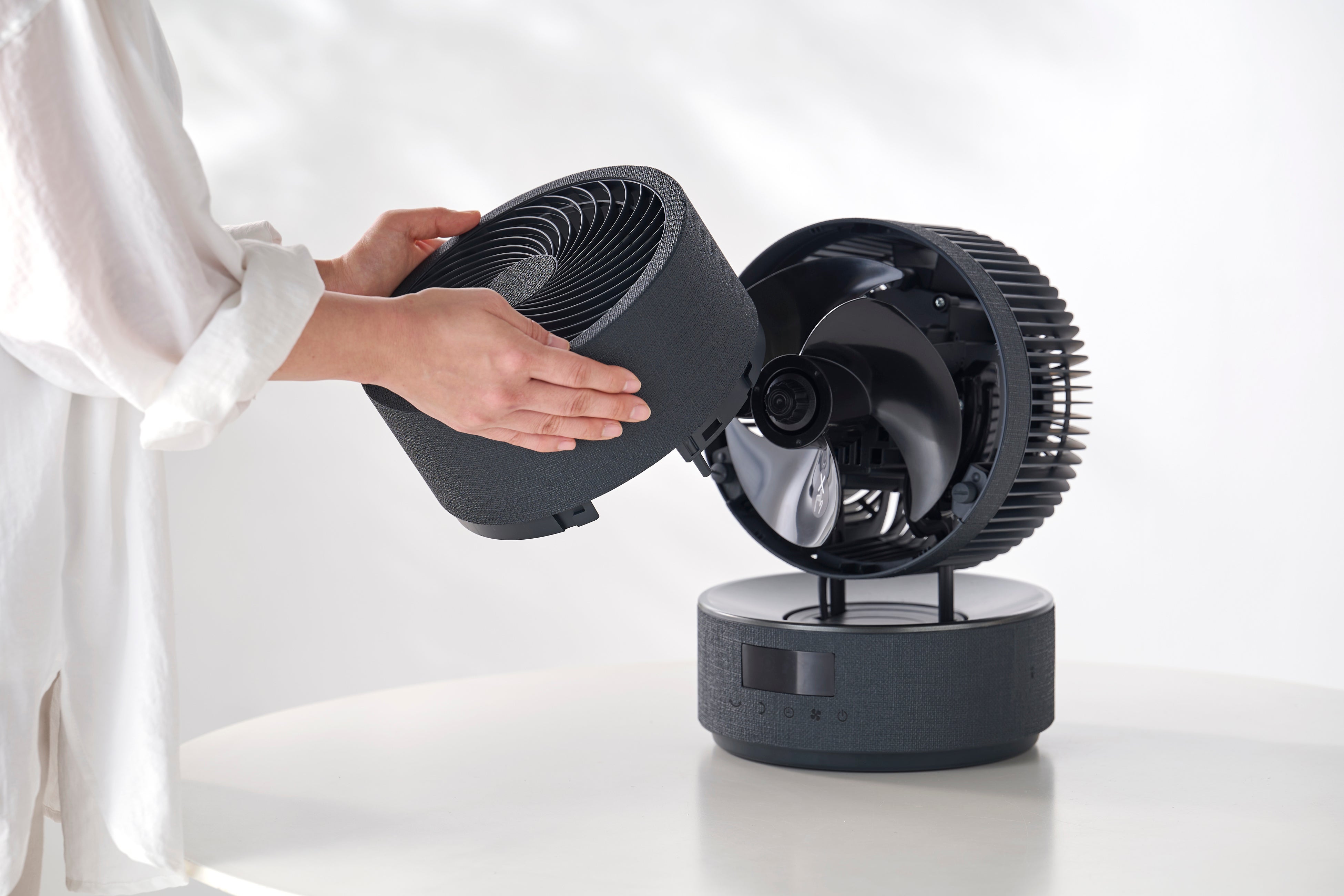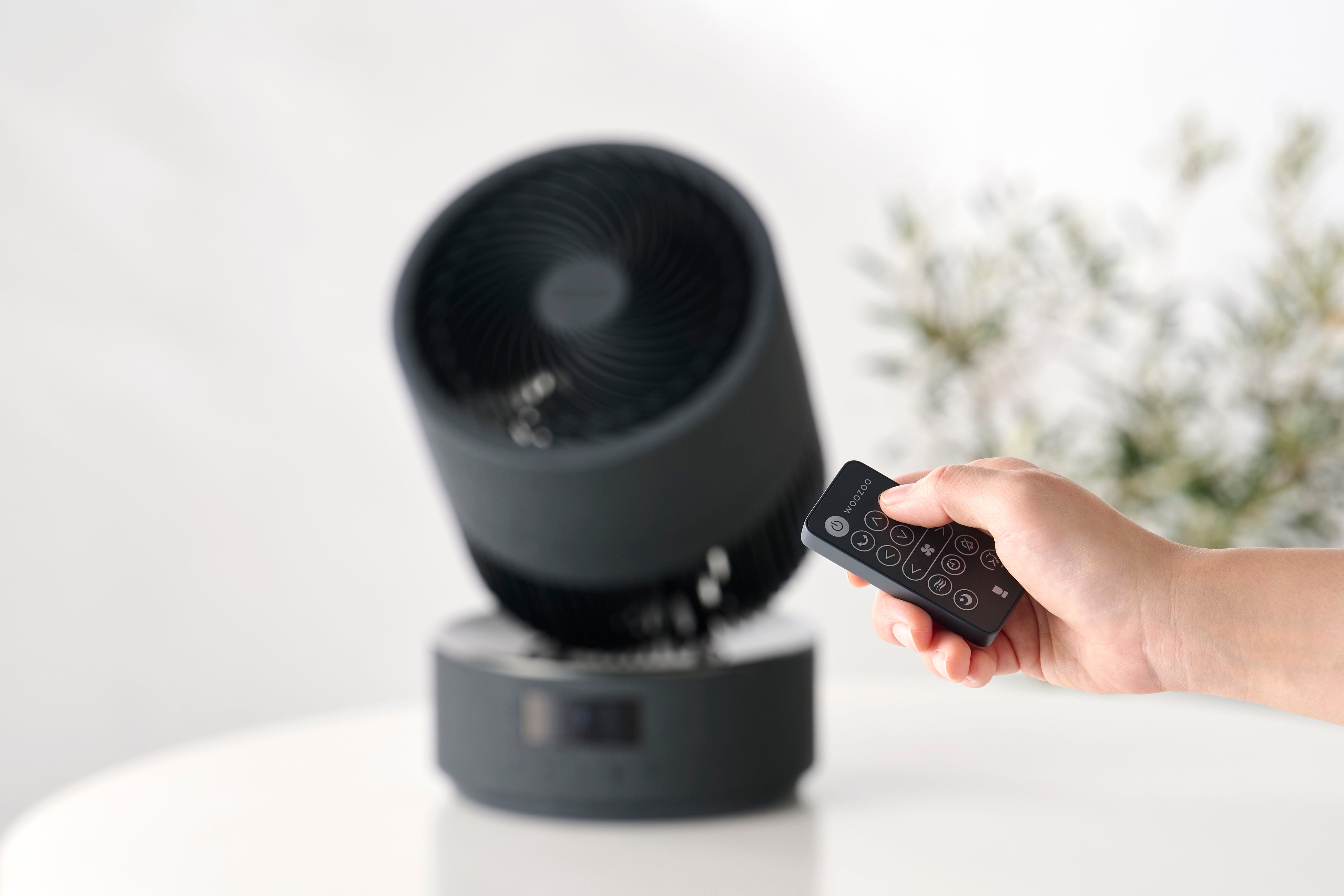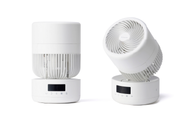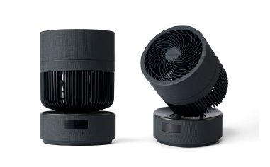 今回発売する「WOOZOO 360 barrel」は、送風部や台座の外側にファブリック調のデザインを採用(※1)し、台座の表面には金属のような光沢を施す(※1)ことで、洗練された高級感のある外観により、上質な居住空間を実現します。また、使用中に電源を切ると稼働中の位置から円柱型の状態で停止するため、インテリアとしてもリビングや寝室の雰囲気に調和します。