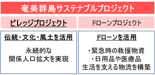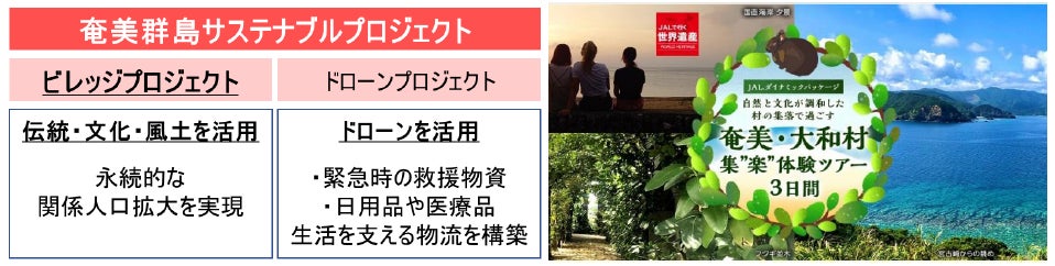 JALグループは「社会課題を解決し、サステナブルな人流・商流・物流を創出する」というESG戦略のもと、「奄美群島サステナブルプロジェクト」として、地域の伝統・文化・風土を活かした永続的な関係人口拡大の取り組み(ビレッジプロジェクト)および、ドローンを活用した地域課題の解決を目指す取り組み(ドローンプロジェクト)を推進しています。