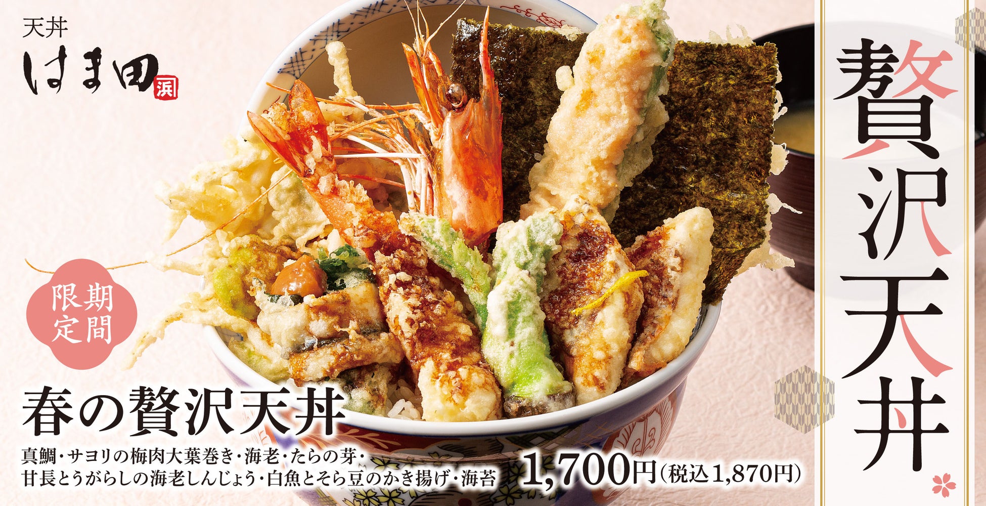 「こんなお店があったらいいな」を身近に。 がコンセプトの天丼はま田では、2021年から限定メニューとして販売している「冬の贅沢天丼」が、その時期ならではの食材を堪能できると、毎年大変ご好評いただいております。そこで、冬だけでなく"贅沢天丼シリーズ" として季節の食材を天丼でお楽しみいただきたいと考え誕生 したのが「春の贅沢天丼」です。