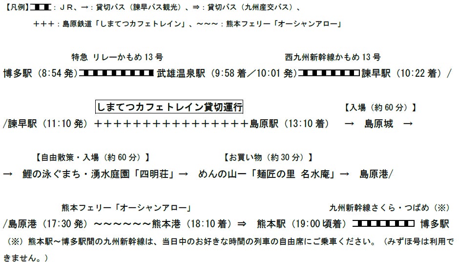 九州旅客鉄道株式会社(以下、JR九州)では、JR九州オリジナルツアー「しまてつカフェトレイン&島原めぐり」を販売中です。当ツアーでは、魅力的な4つの乗り物に乗車!「西九州新幹線」、「九州新幹線」、島原鉄道「しまてつカフェトレイン」、熊本フェリー「オーシャンアロー」に乗って旅をします。
