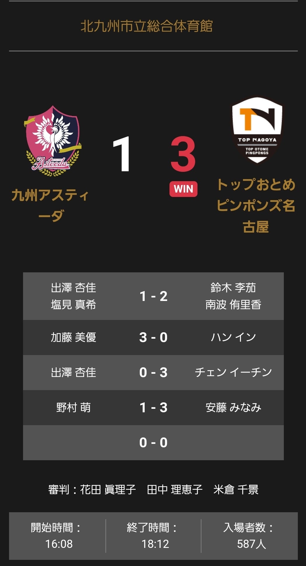 ノジマTリーグ 2022-2023シーズン 公式戦 12月28日 九州アスティーダ vs トップおとめピンポンズ名古屋 試合結果