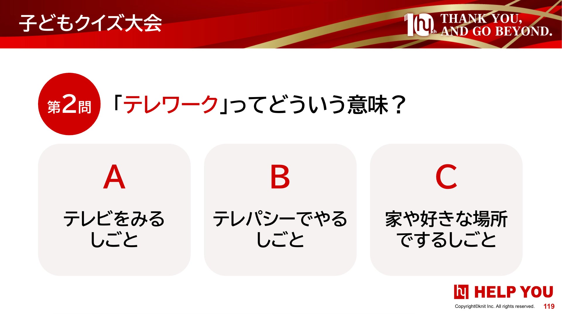 10周年記念イベントには、多くのお子さんが参加してくれました。会場には、小さなお子さんも楽しめるキッズスペースを用意し、お子さん向けのクイズ大会も開催。内容にはリモートワークやテレワークへの理解を深める工夫を盛り込みました。間接的ではありますが、親御さんの仕事を知るきっかけにもなったはずです。