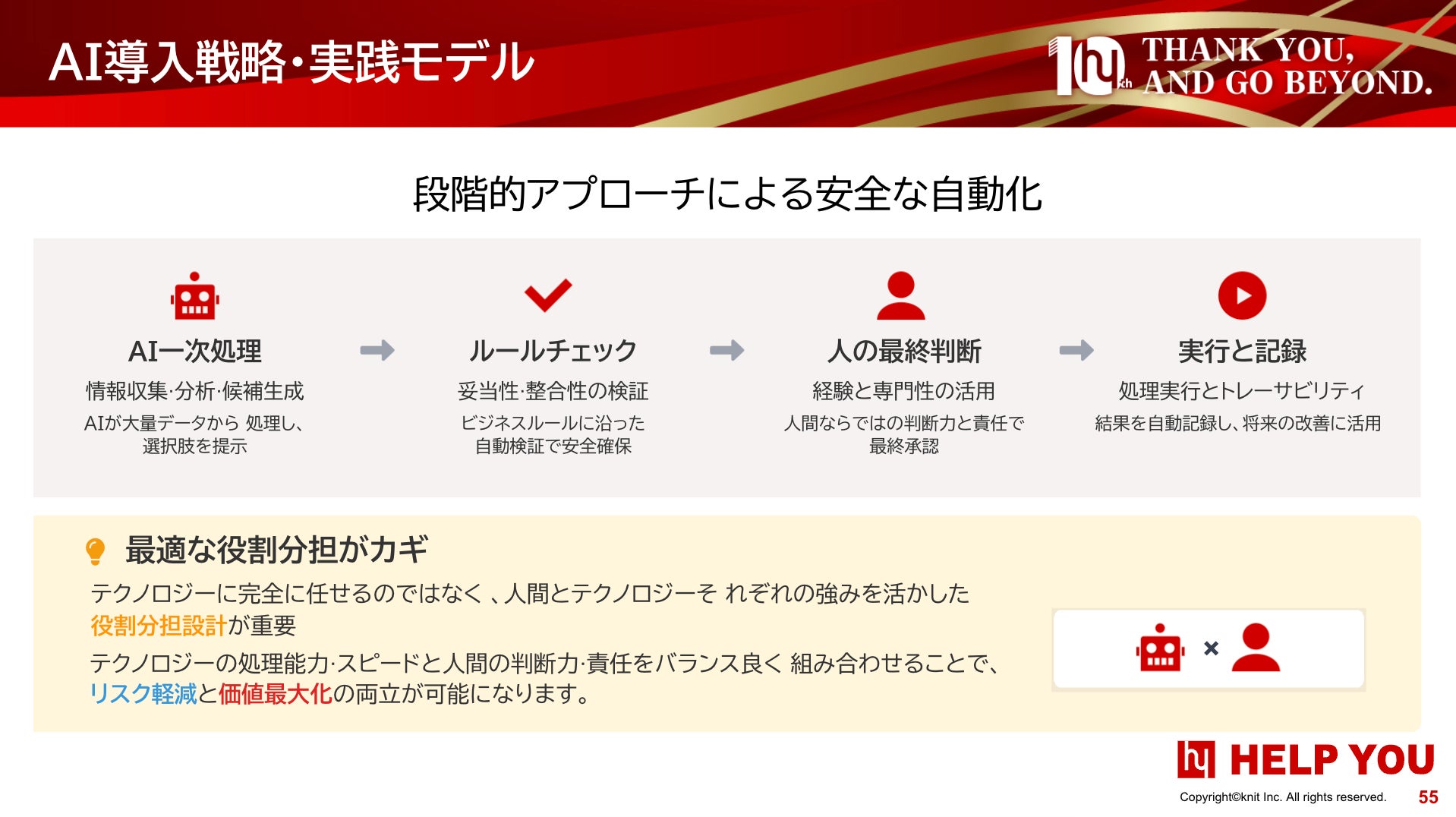 このように、AIと人の役割を適切に分担し、分野横断の知見を組み合わせることで、企業ごとに異なる課題へ柔軟に対応できます。こうした支援のあり方こそが、BPO×AI時代におけるHELP YOUの価値であり、「新しいBPOの姿」といえます。