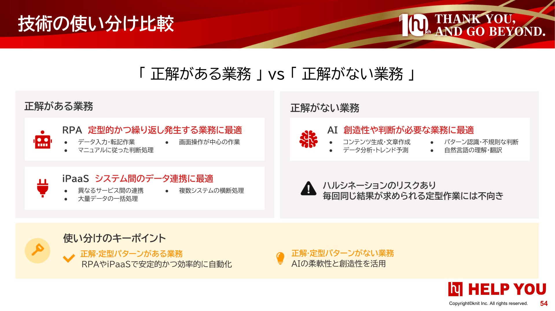 テクノロジー活用の柱を「RPA」「iPaaS」「AI」に整理し、それぞれが役立つシーンを紹介。RPAやiPaaSがデータ入力のような「正解がある業務」を得意とするのに対し、AIはコンテンツ作成や分析など「正解のない業務」でこそ力を発揮するとパネリストは説明しました。