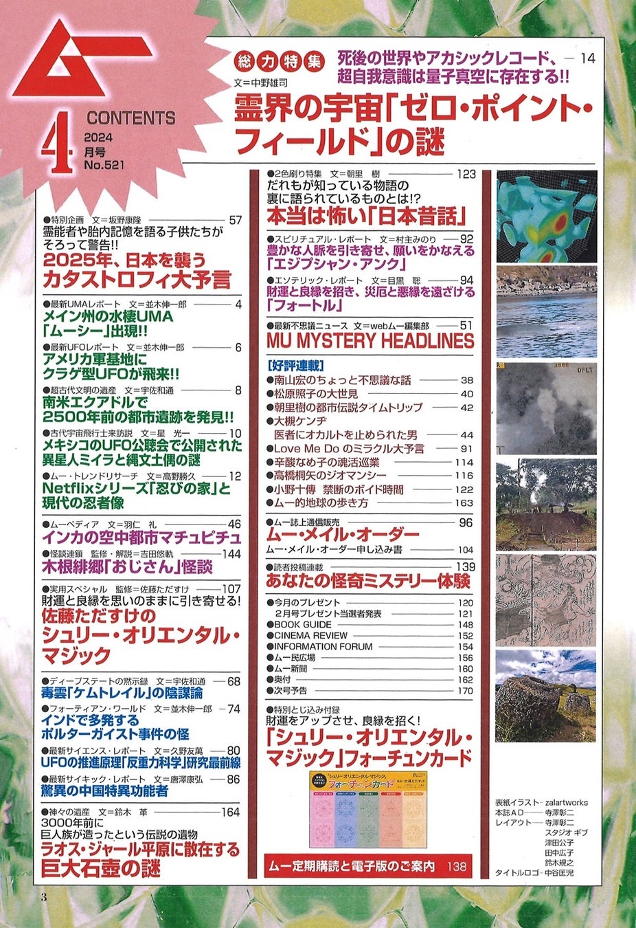 総力特集は、霊界の宇宙「ゼロ・ポイント・フィールド」の謎 月刊「ムー」4月号発売‼