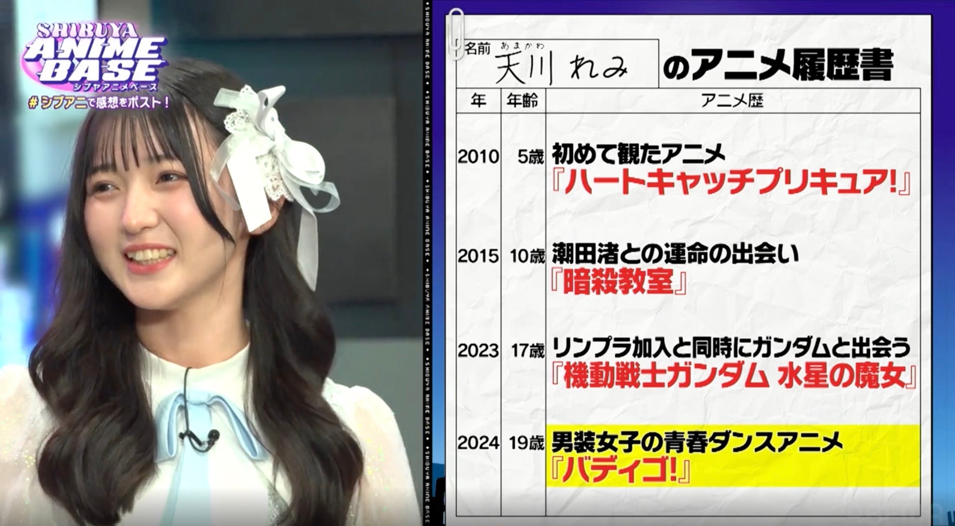 続いて、LINKL PLANETの天川れみさんは、2010年、5歳のときに『ハートキャッチプリキュア』でアニメに出会い、10歳のときには『暗殺教室』で潮田渚に「ガチ恋しちゃいまして…」と恥ずかしそうに告白。情緒に影響しちゃうくらいの作品だったと振り返ります。そして、今年は熱血アイドルラブストーリー『バディゴ!』で男装女子にハマったことも明かしました。
