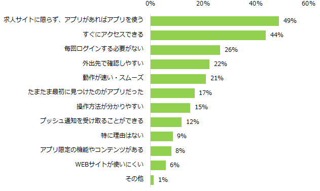仕事探しで主にアプリを利用している方に、いくつ使っているかを伺うと、83%が「2つ以上」(2つ:32%、3つ:28%、4つ以上23%)と回答しました。求人アプリを使う理由の上位は「求人サイトに限らず、アプリがあればアプリを使う」(49%)、「すぐにアクセスできる」(44%)でした。利用している求人アプリの気に入っている点についてもご紹介します。