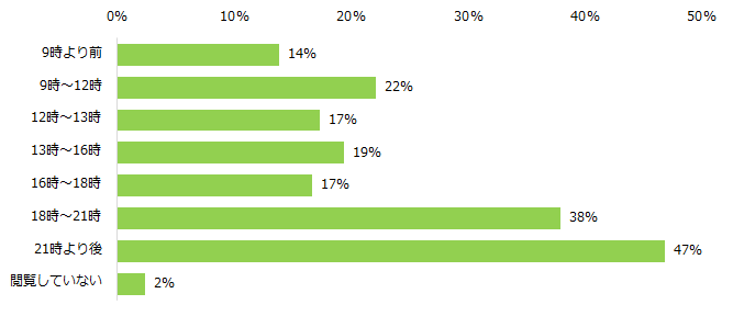 求人サイト・アプリを閲覧する頻度を伺うと、最多は「毎日かつ1日2回以上」(35%)でした。年代が上がるごとに閲覧する頻度が増える傾向です。また、求人サイト・アプリを閲覧する時間帯については「21時以降」と回答した方が47%で最多でした。